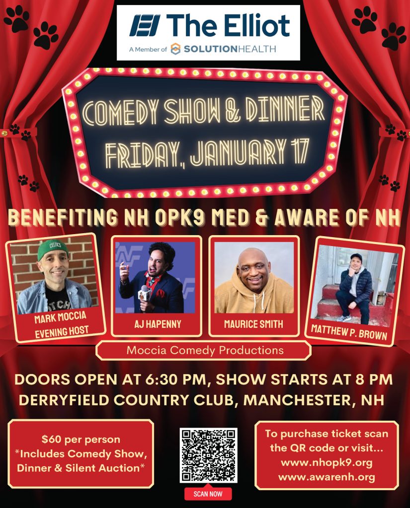 Presented by The Elliot, the evening will feature a night of stand-up comedy, dinner and a silent auction featuring sports memorabilia, area restaurant gift cards, pet care baskets and lots more with proceeds supporting NH OpK9 Med and AWARE NH. Attendees will enjoy a fun evening while contributing to the life-saving efforts of these two New Hampshire-based nonprofit organizations.