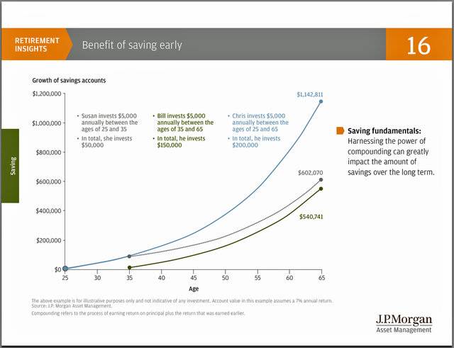 What the math doesn’t show is how the loss of income effects our pension, Social Security, and our ability to save for retirement. Below I have included a chart (there are many examples, from many financial institutions (I just chose one that I found easy to read) that illustrates how saving at a younger age makes a huge difference when we reach retirement age. Decisions being made now will effect us when we’re 70.