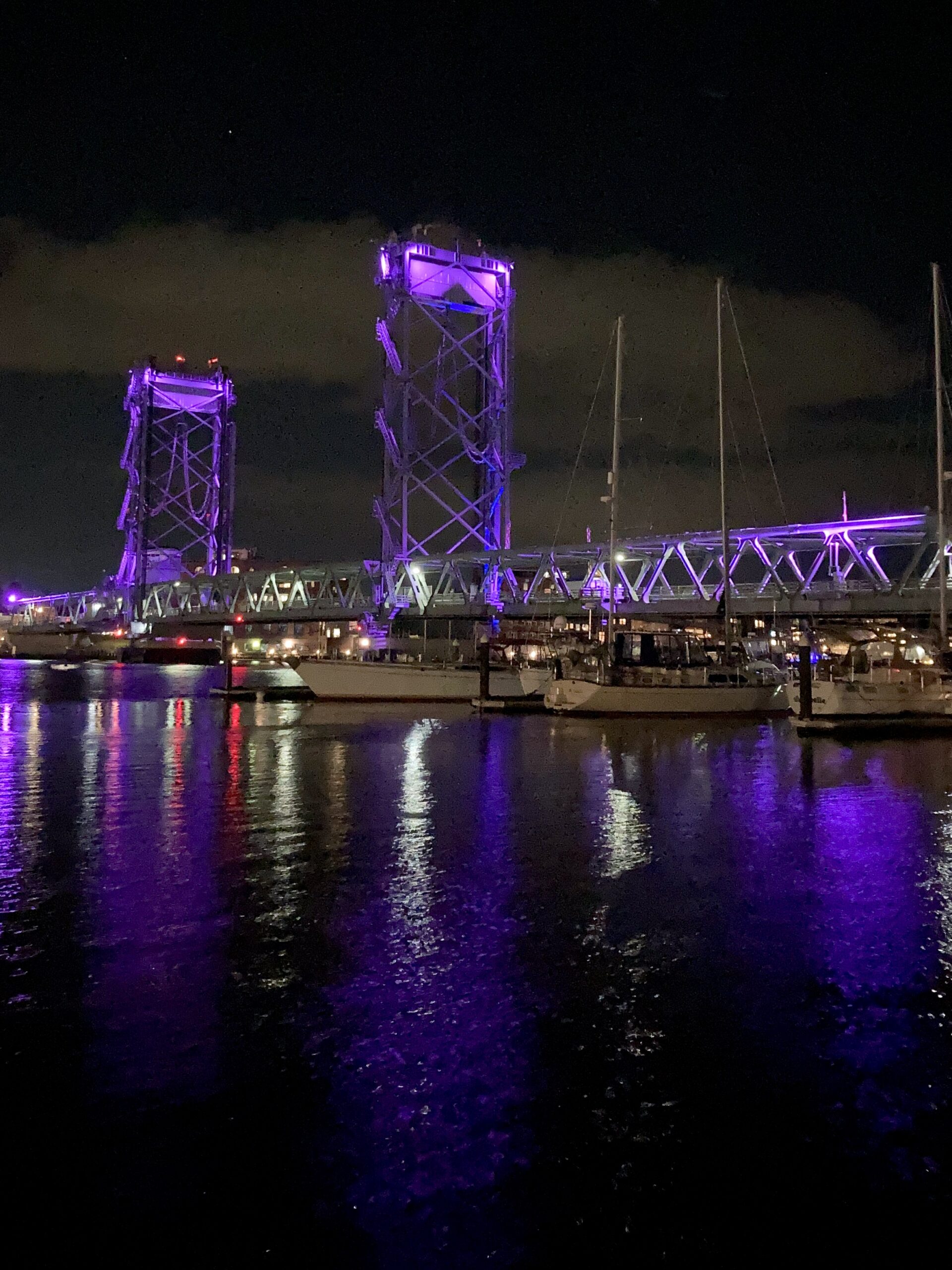 Portsmouth Memorial Bridge illuminated purple in 2022 for World Pancreatic Cancer Day.