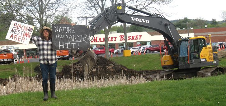 On May 13 and 14, as part of a parking lot repaving upgrade project directed by Market Basket (MB) in Milford, NH, and carried out by the contractor Continental Paving, about a half-acre of wet pond at the property’s entrance was dredged. The pond, designed in 1995 for stormwater drainage, had become populated by a dense stand of cattails that served as a nesting site for red-winged blackbirds and grackles.