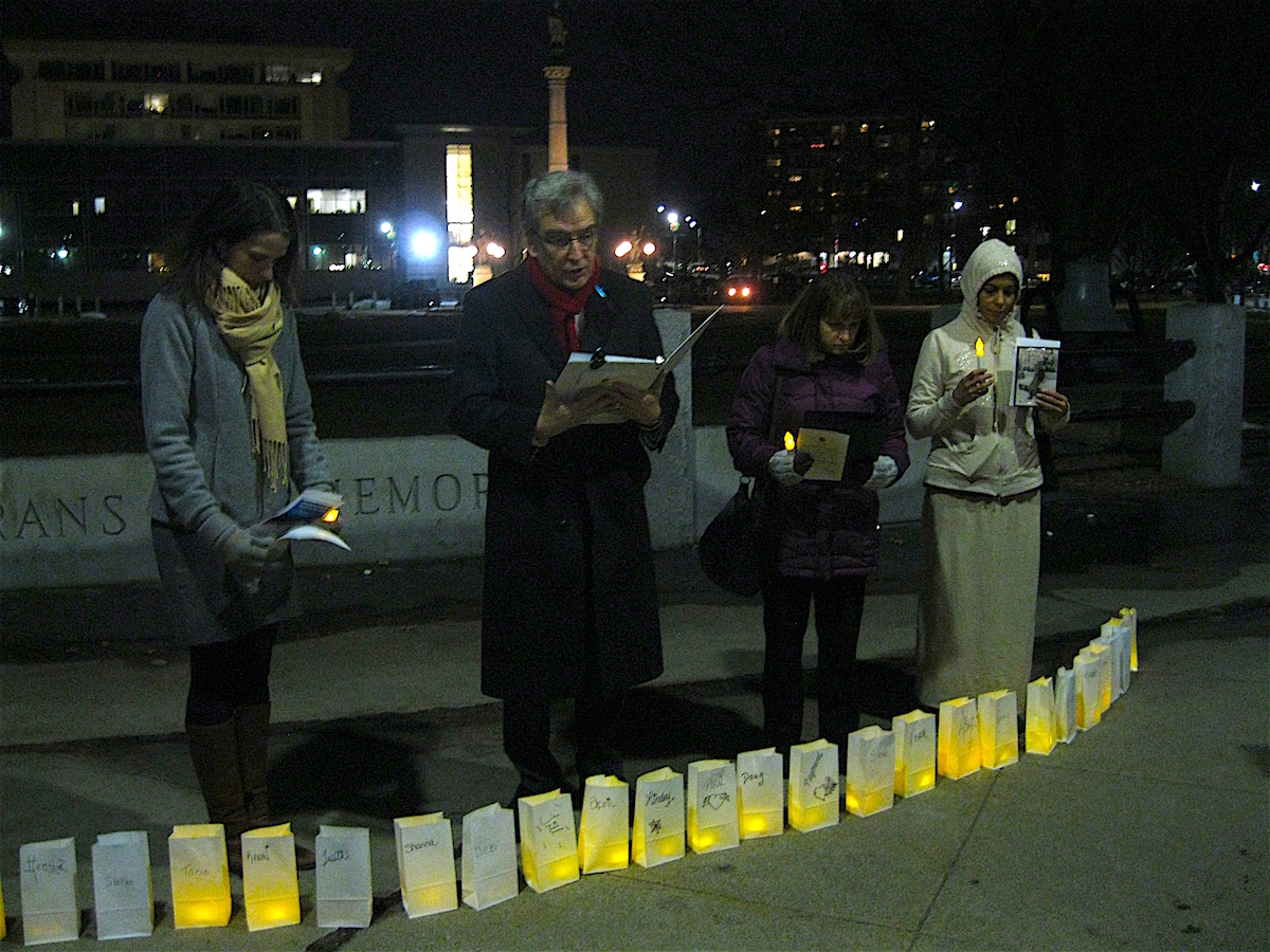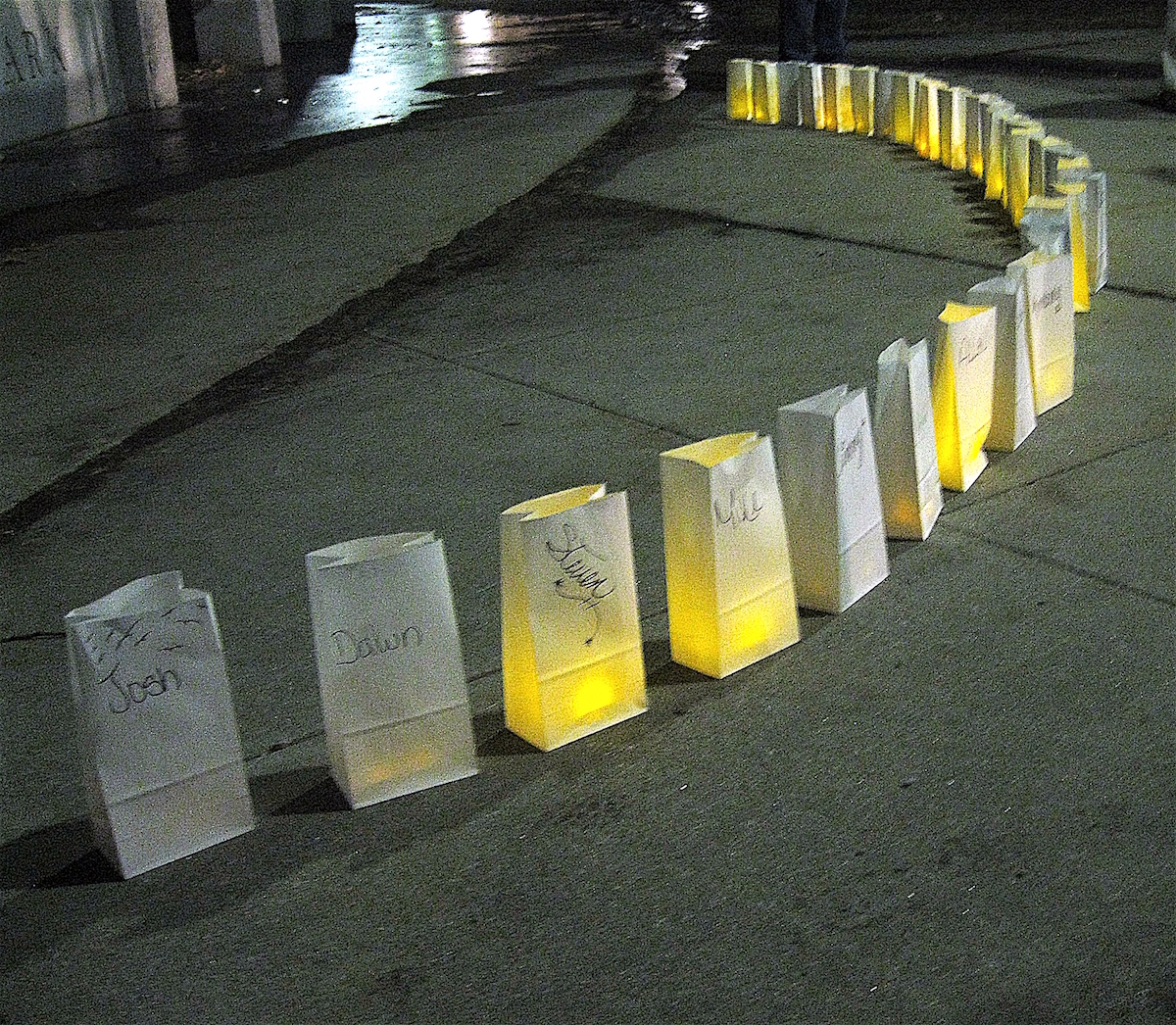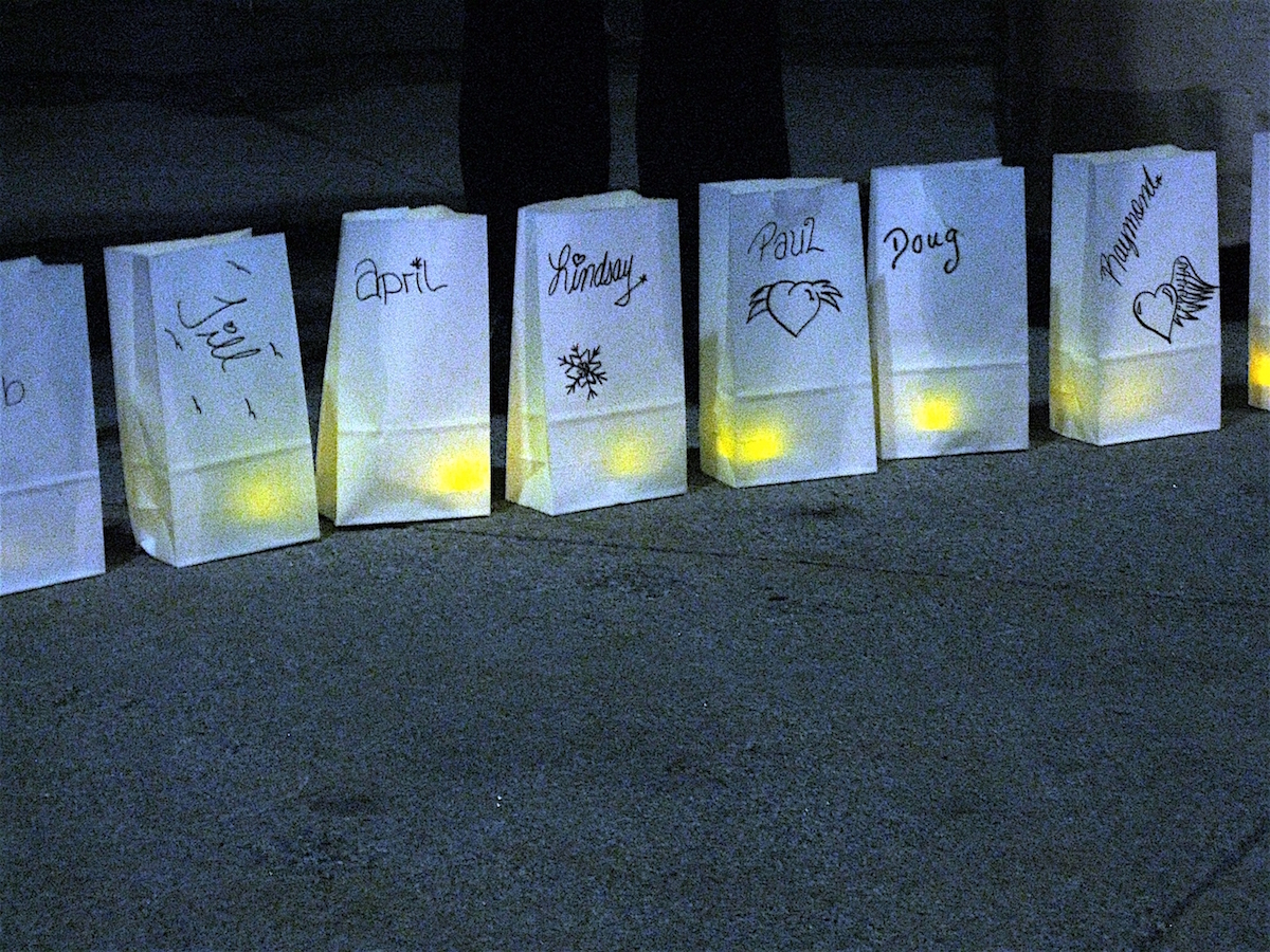 Luminaria – white paper bags illuminated from within by battery-powered tea candles – were lined up on the ground in front of the small group of speakers. Each luminaria bore a name of someone who had died in 2018: