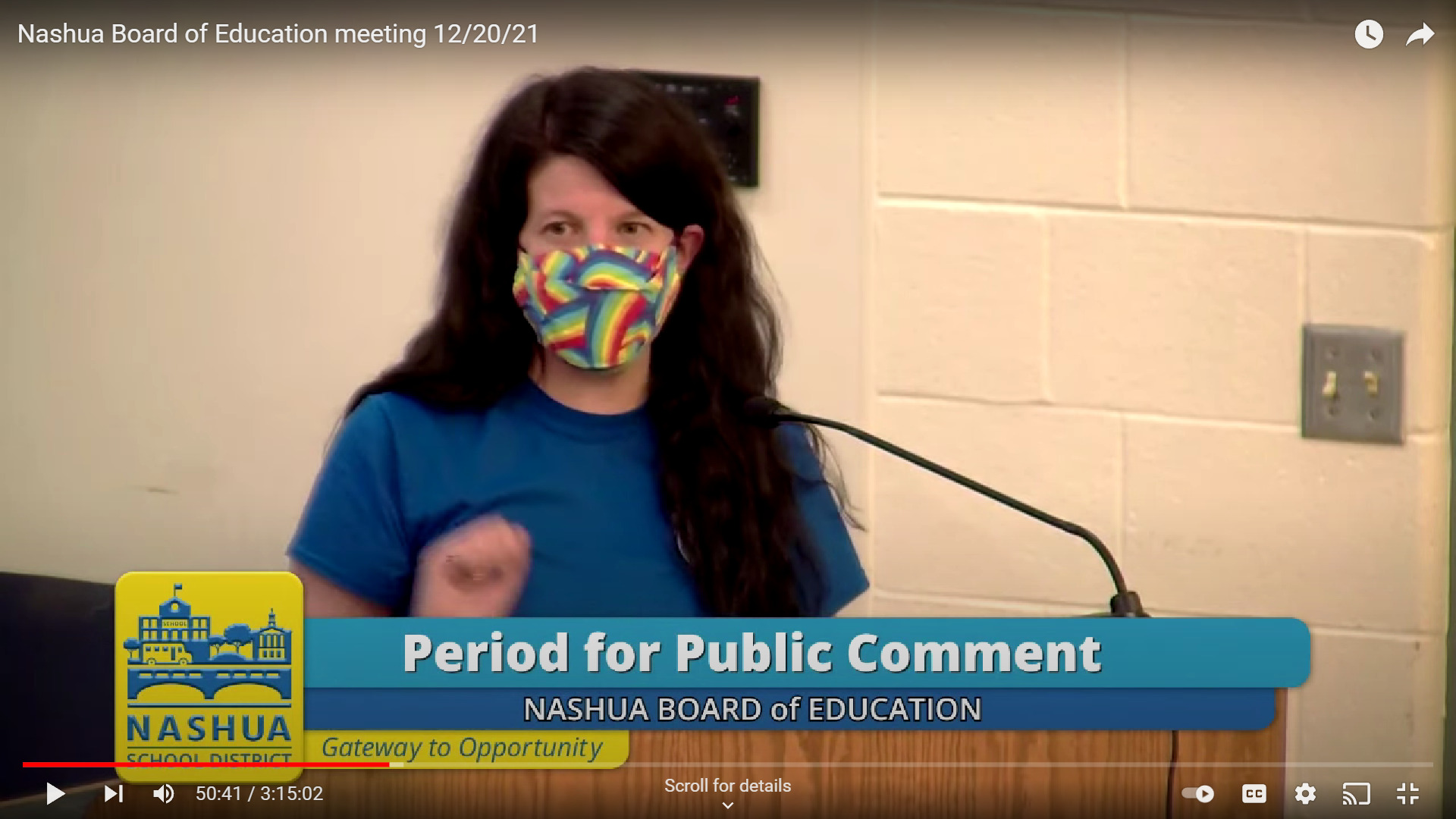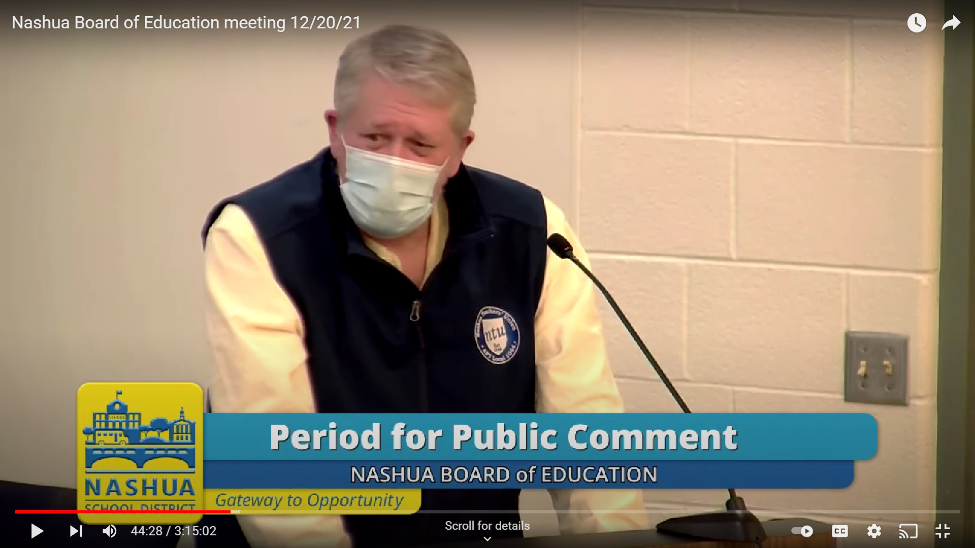 Nashua teacher Walt Freeman stepped up to the mic speaks at Nashua’s Board of Education Meeting in December. (Screenshot)