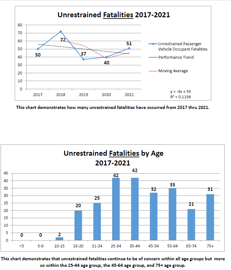 There was an increase in the seat belt use rate in 2021 to 75.5%, up from 72.4% in 2020. The plan notes that the seatbelt law for vehicle occupants under age 18 โseems to be working, as unrestrained fatalities decreased in the 16-20 age group (2017-2021).โ