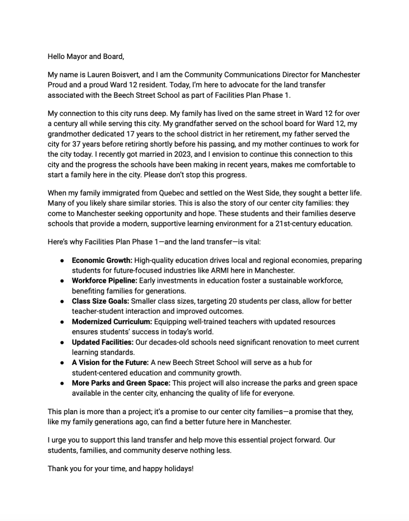 7:27 p.m. – Heather McGrail: As CEO of Greater Manchester Chamber of Commerce, we support Priority 1 (Phase 1 of School Facilities project). I wanted to come and reaffirm our support. You are all champions of our city, we are hearing from ARMI, many other industries. Workforce development is dependent on education. Business leaders are uncertain and disappointment on Beech Street School pause. New school will bring economic benefit. It has been researched with due diligence.