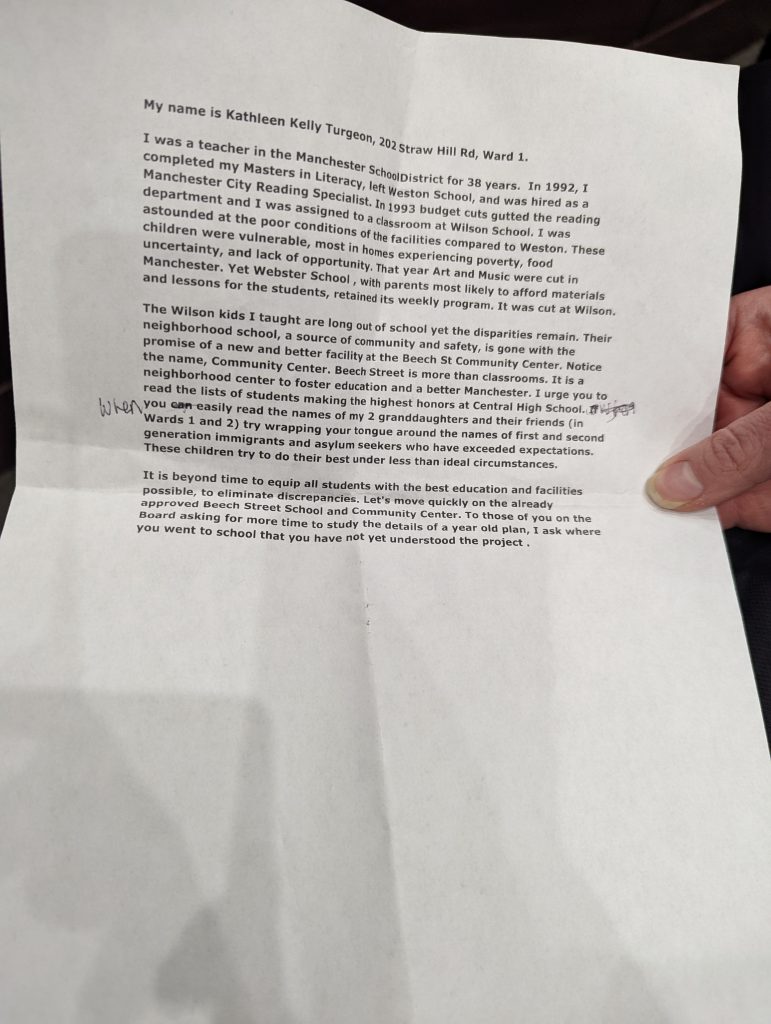 7:31 p.m. – Christine Seibert: Reads a letter from Kathleen Kelly Turgeon who could not make it due to concert at Central High School tonight, but supports new Beech Street School.