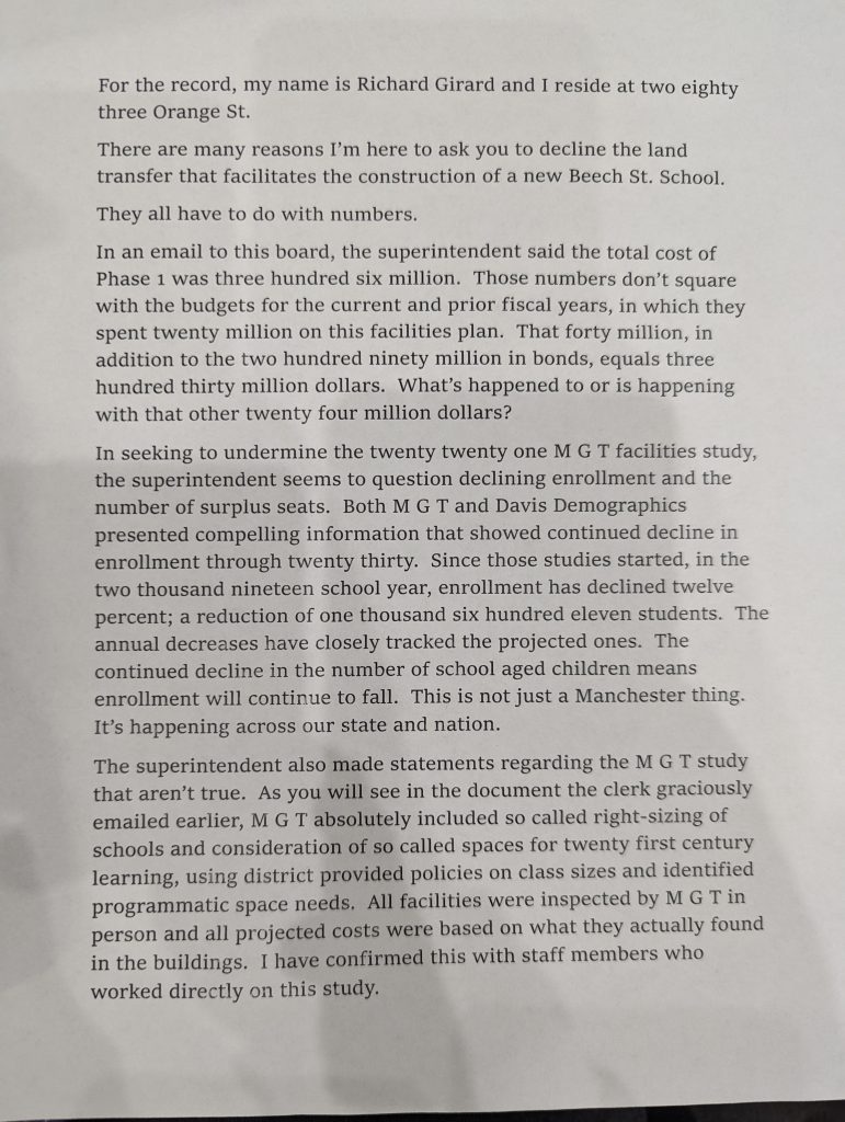 7:13 p.m. – Lou D’Allesandro: I look at the sign before me saying speak loudly, that the microphone is not working. That has never been the case in not speaking loud enough. I speak positively about Beech Street Elementary School. I’ve been a resident of Manchester for past 60 years…. what benefits the public is of maximum importance to the growth of our city, state and our country and education is essential. I participated in kindergarten acquisition at Bakersville while on School Board, people rebelled for a time. I participated in acquisition of Parkside. Many of you have sent children to Manchester schools. This project is financially sound. The money has been allocated and the school district can handle the debt. What will be provided is an enhancement of to the children of our city…. I want available to my children what was available to me. …. This is important to the children of our city who are the future of our city and the future of our state.