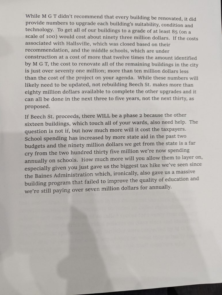 8:13 p.m. – Mark McClean: I am a state rep from Ward 8. I normally don’t testify at these meetings. Beech Street is a want, not a need. If we had a lot of money, it’d be fine. At Ward 8 meetings, people ask about opioids, PR Bail, but not schools…… bond payment has sketchy assumptions….state is keeping a careful eye on every single penny….. we will be carrying the bulk of this burden alone. Between this and sewer system, you just have to assume that the burden is too great and you have to investigate other alternatives.