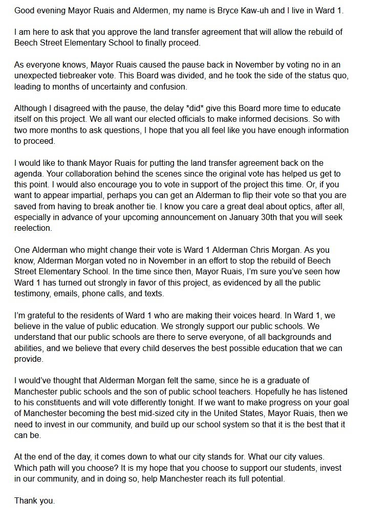 8:47 p.m. – Arnold Mikolo: I am a Manchester resident and president of Manchester NAACP. I strongly support the rebuilding of Beech Street. The NAACP aims to achieve equality, political rights and social inclusion and economic security for all people of color. I am here in strong support of this elementary school because a child’s environment significantly impacts their success…. Ward 5 is one of the most overburdened places not just in Manchester or New Hampshire, but in all of America. It is currently ranked in the lowest in the nation because of an environment because the people there that they did not create….. if we hope to change this cycle, we must address these issues of poverty. No more classrooms in basements or without windows….Beech Street includes many families from low income or immigrant communities. These families cannot support students outside of school….