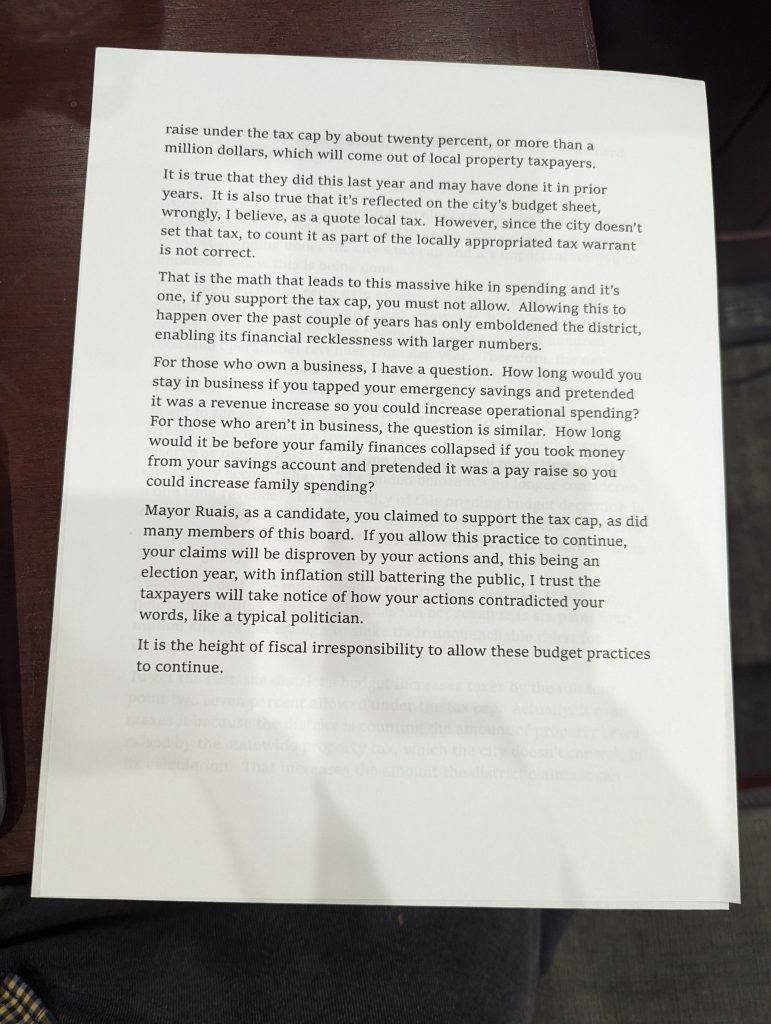 Rick Glatz 7:06 pm – This is the first time I’ve testified here, I am a semi-retired teacher. I drive on roads around the city regularly and I wonder if we are spending the city’s money well on the right materials given the frequent construction.