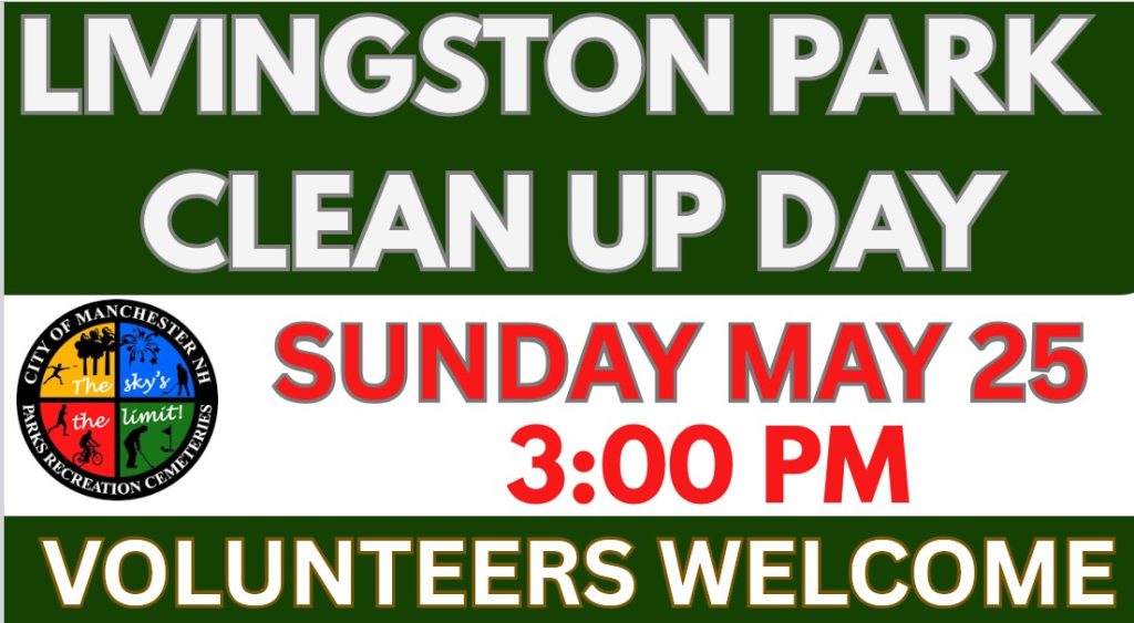 Manchester, NH – Community members are invited to take part in Livingston Park Clean-Up Day on Sunday, May 25 at 3:00 PM. The clean-up effort is an opportunity for residents to come together and help maintain one of Manchester’s most popular parks and roadways along DW Highway.