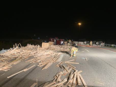 Initial on-scene investigation revealed that a 2003 Kenworth with a flatbed trailer loaded with lumber being driven by Robert Ross, 62, of New Brunswick, Canada, was traveling southbound when ROSS lost control of his vehicle.ย After losing control, the tractor-trailer struck the center median guardrail which resulted in it overturning and blocking all southbound lanes of travel. Additionally, the load of lumber it was carrying was separated from the trailer and scattered along the roadway and adjacent grass median.