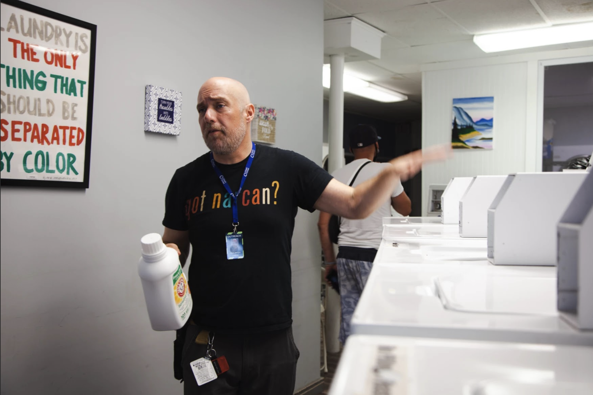 While the washing and drying machines run at full speed, Dam Wright, an advocate who does outreach to Manchester’s unhoused community, makes sure everyone has what they need, from coins to free detergent. He says around 70 unhoused people use the laundromat twice a week.