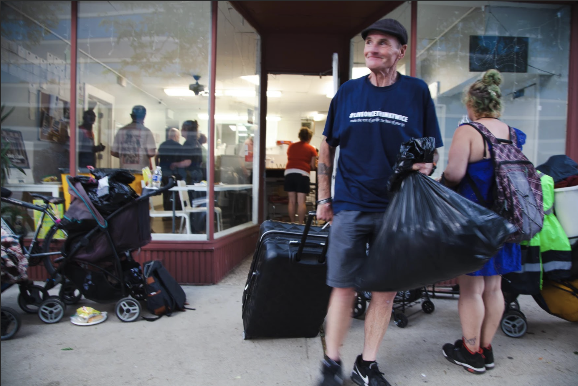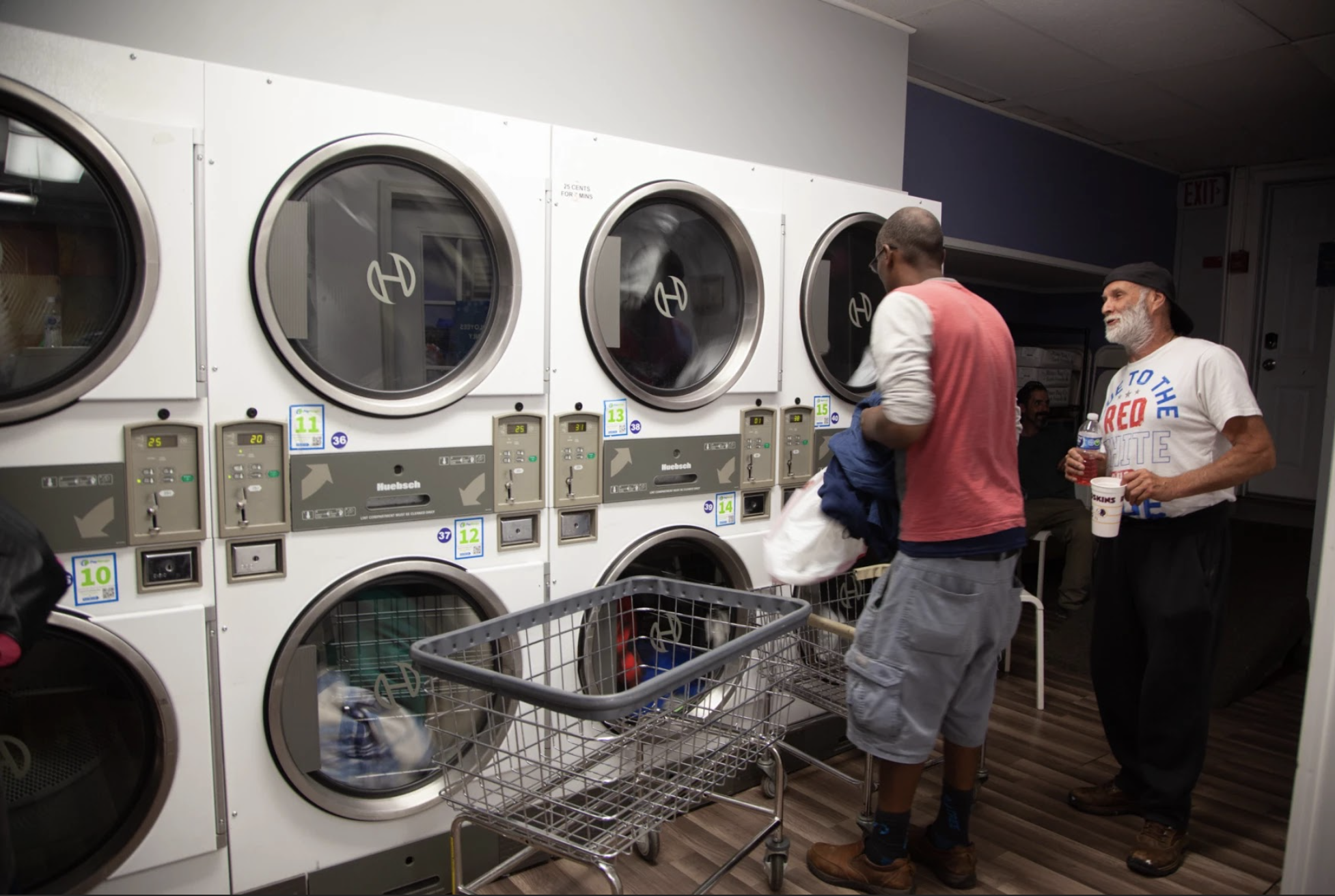 Some walk a few blocks from the city’s shelters or where they park their cars, carrying their clothes in plastic bags. The people who live further, under bridges or in the woods, use shopping carts and old suitcases they’ve found to bring in their laundry.