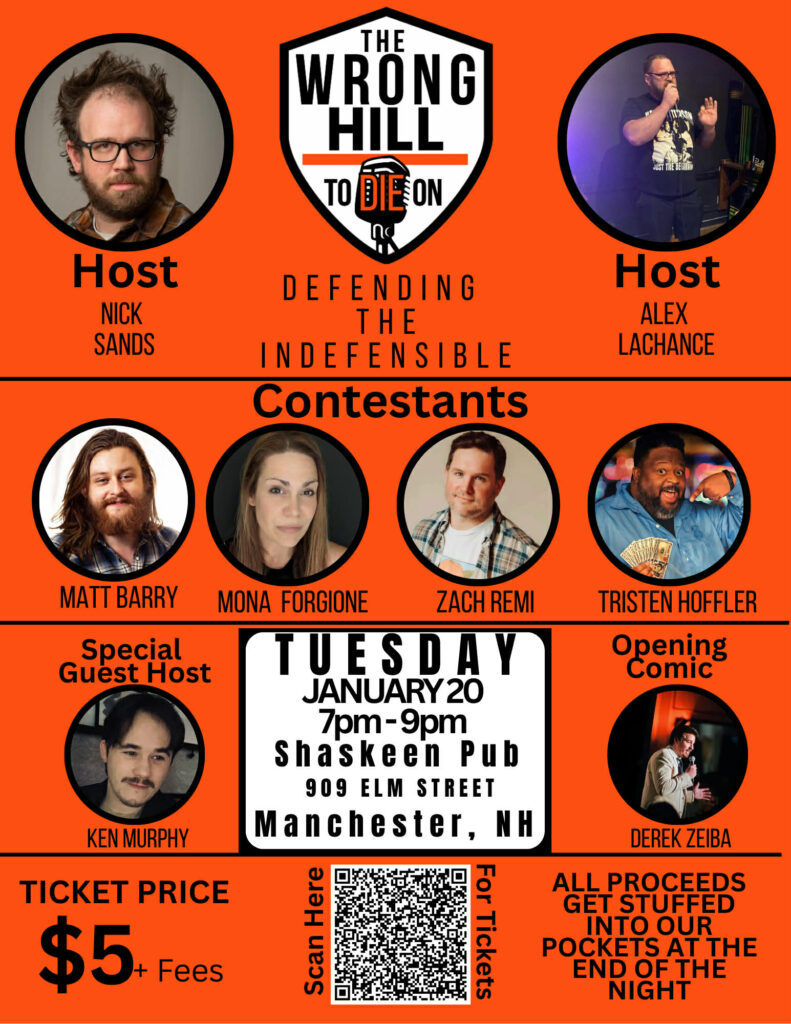 On Tuesday, Jan. 20, at The Shaskeen Pub and Restaurant in downtown Manchester, eight comics will take to the stage for “The Wrong Hill to Die On,” a live improvisational performance where four contestants—Matt Barry, Mona Forgione, Zach Remi and Tristan Hoffler—will attempt to defend absurd and controversial “hot takes” to a panel of three fellow comics and a live audience.