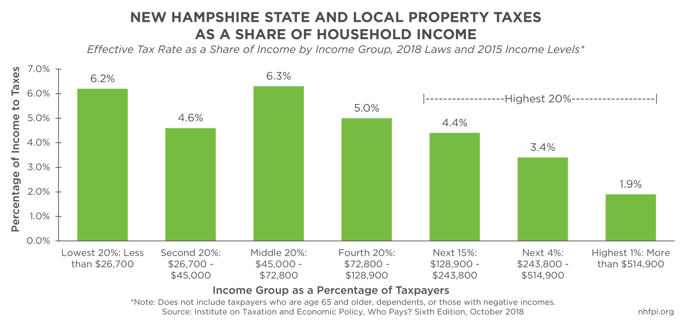 Despite those relatively small rebate values, the expanded program helps to address the disproportionate percentage of property taxes paid in relationship to household income by low- and moderate-income homeowners. A 2018 analysis by the Institute on Taxation and Economic Policy estimated that state and local property taxes in New Hampshire amounted to the equivalent of 6.3 percent of income for middle-income earners under age 65, and 6.2 percent for those in the lowest 20 percent of income-earners. The households with incomes in the highest one percent paid an estimated 1.9 percent of their incomes in property taxes.