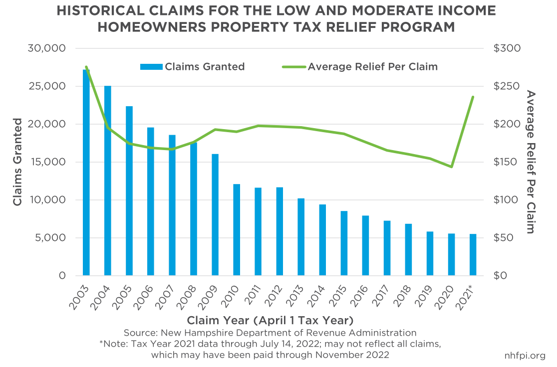 This change substantially expanded eligibility and boosted potential relief for lower-income homeowners. The income cap was raised to $37,000 for an individual and $47,000 for a married couple or head of household. In 2021, about 1 in 4 New Hampshire households, or roughly 151,000, had incomes below $50,000 per year.