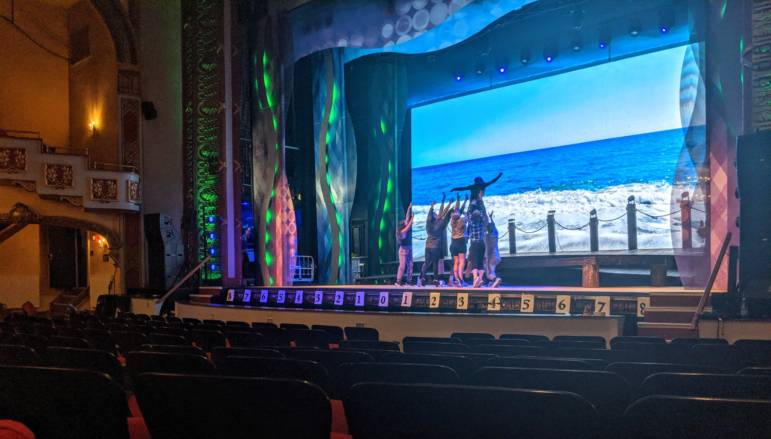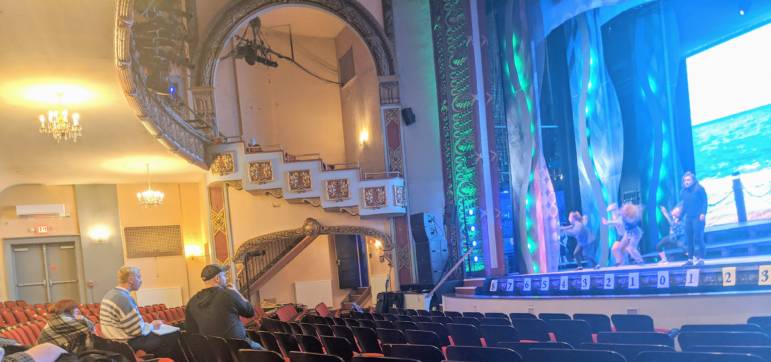 Oh, and for the first time on the Palace stage, a 5,000-pound 30-by-20-foot high-res video backdrop creating a splashy beachscape for the production, set on a fictional Greek isle. Palace President and CEO Peter Ramsey told the group before entering the theater that the video screen rental, from Gateway Productions, is a state-of-the-art game-changer for modern theater, and the Palace will be maximizing use of it over the next four months. It took two days to assemble on stage, a patchwork of 264 individual panels that creates an additional “wow” factor.