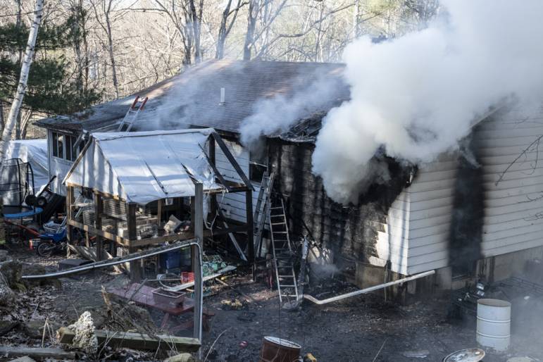A home on Dunbarton Road near the Goffstown line was heavily damaged by fire on April 11. Photo/Jeffrey Hastings