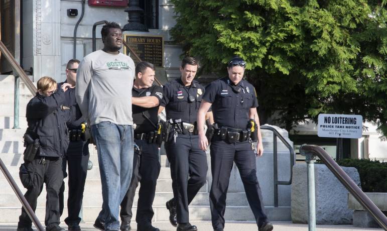 One of the three officers deployed the department issued taser to subdue Etadafimue, who stands at 7-feet-2-inches tall, after he repeatedly kicked Officer Sarah Kuligโs knee. He finally conceded and was placed into handcuffs and transported to police headquarters. He was charged with simple assault, disorderly conduct, criminal trespass and resisting arrest/detention and is scheduled to appear in the 9th Circuit Court-Manchester on September 25, 2018.