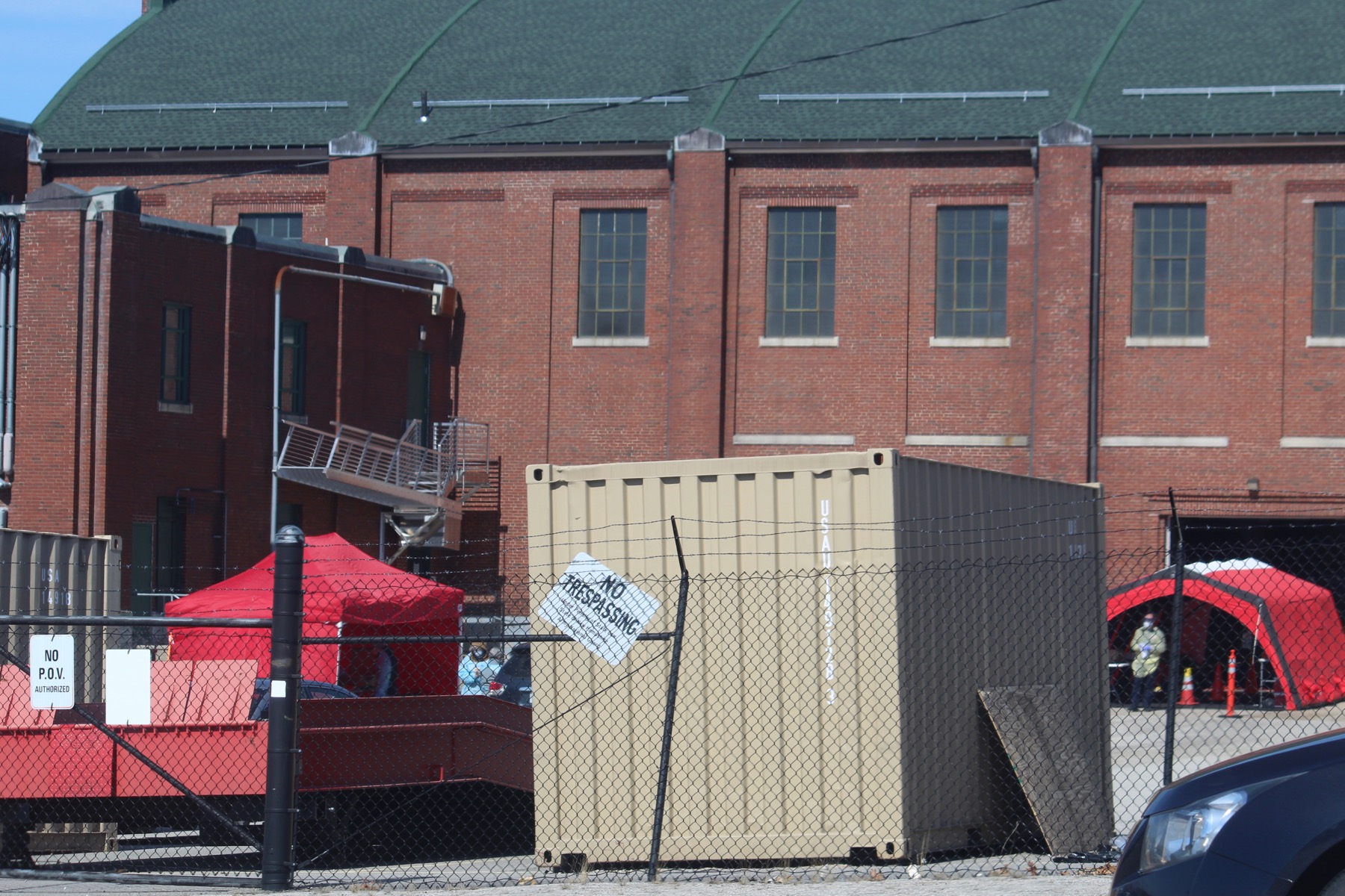 The address led them to the Manchester Armory where two red medical tents were set up behind a fence. There were vehicles with government license plates surrounding the fence, armed guards and an efficient process for driving-through for a swab test.