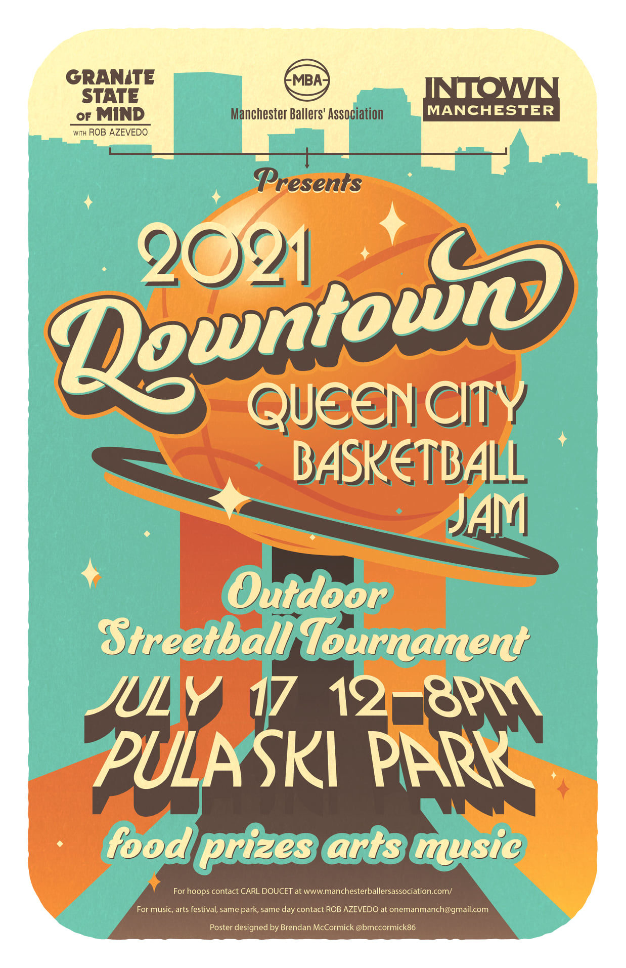 On July 17, The Manchester Ballersโ€™ Association (MBA), Rob Azevedoโ€™s โ€œGranite State of Mindโ€ radio program and Intown Manchesterโ€”New Hampshireโ€™s first and only Business Improvement District โ€” will host the 2021 Downtown Queen City Basketball Jam at Pulaski Park from noon-8 p.m.