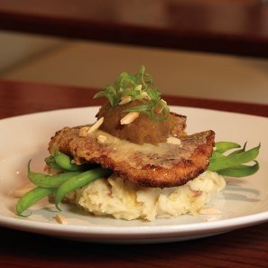 Comfort food at Cotton: Almond crusted turkey schnitzel, with cheddar cheese gratinee, mashed potatoes, buttered green beans and spiked applesauce