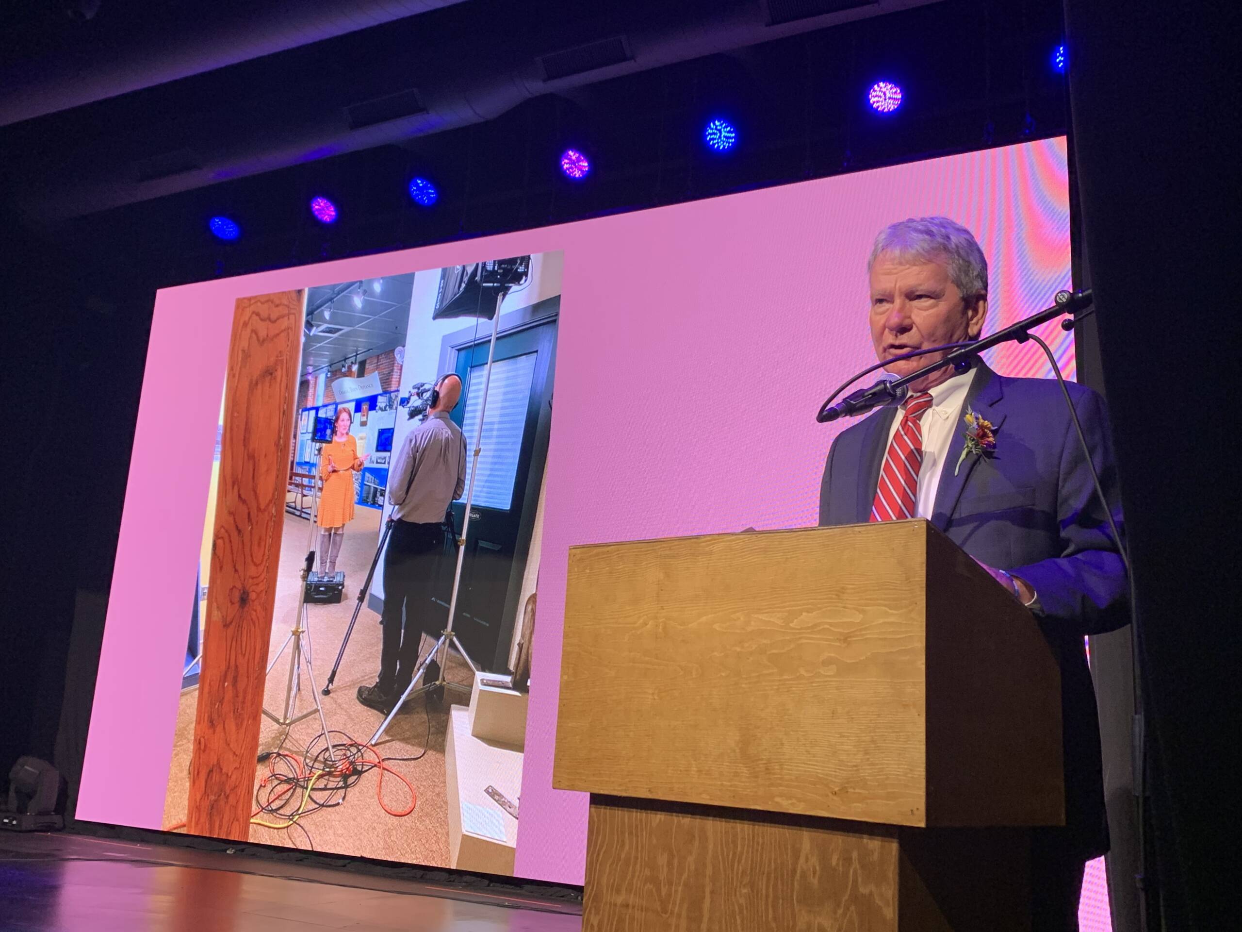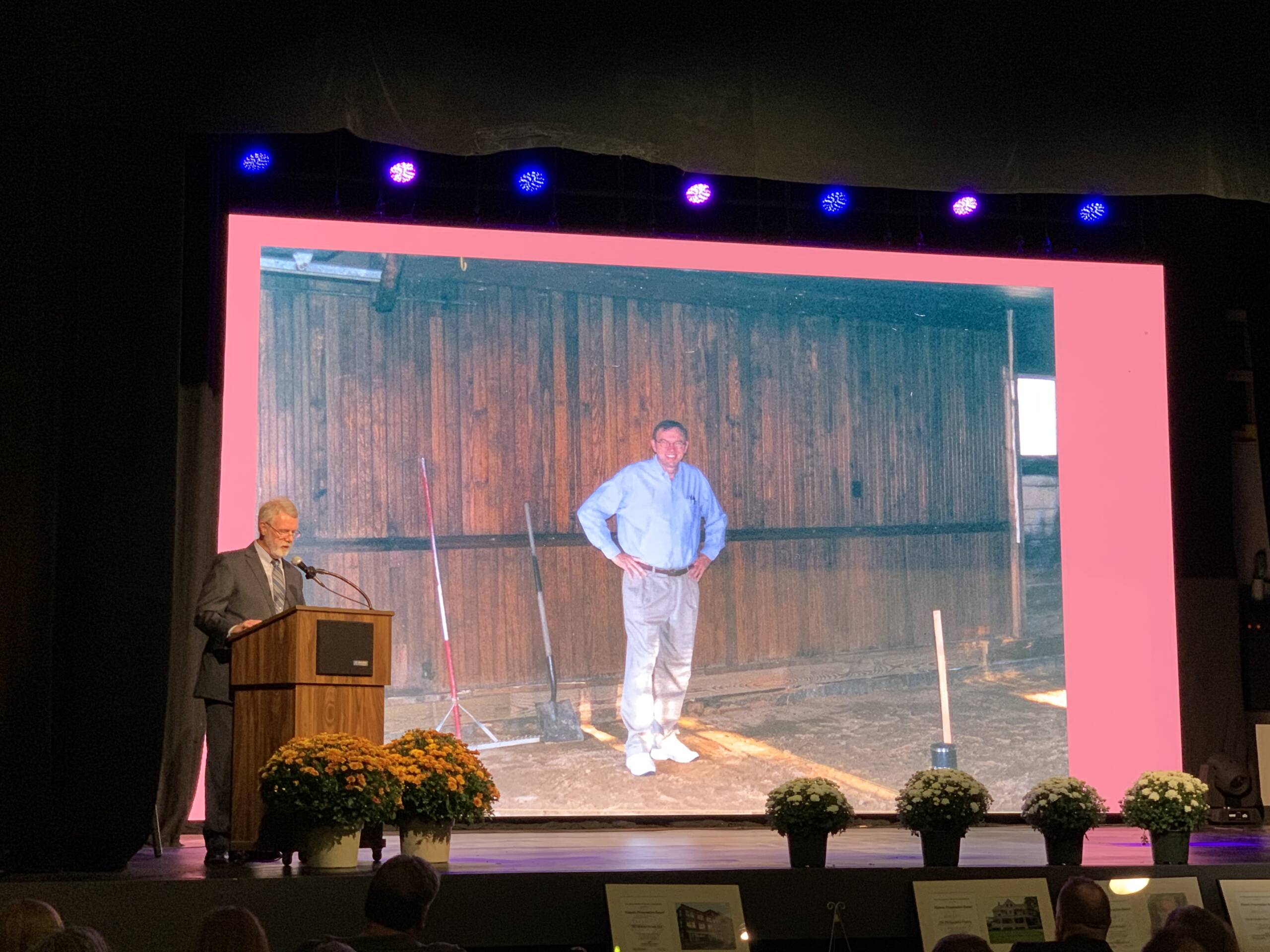 Ed Brouder on stage. Photo of homeowner Stephen McLaughlin, who died in 2016. Photo/Ryan Lessard