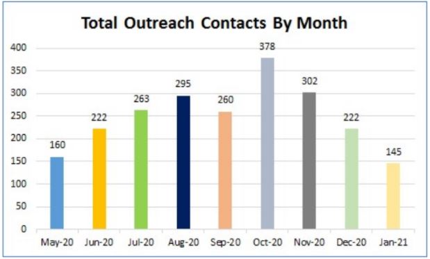 Total contacts by outreach workers have steadily dropped each month since it reached a peak of 378 in October. In January, they were down to 145.