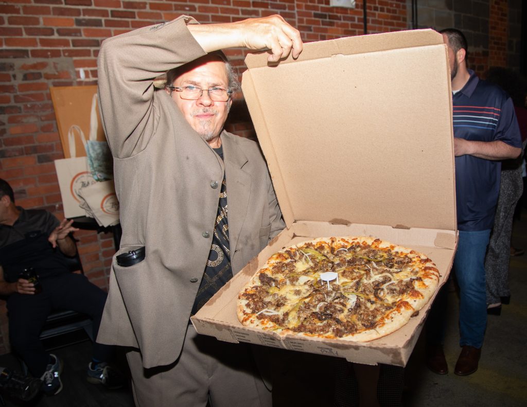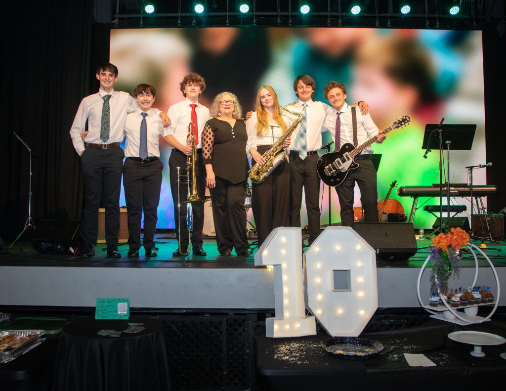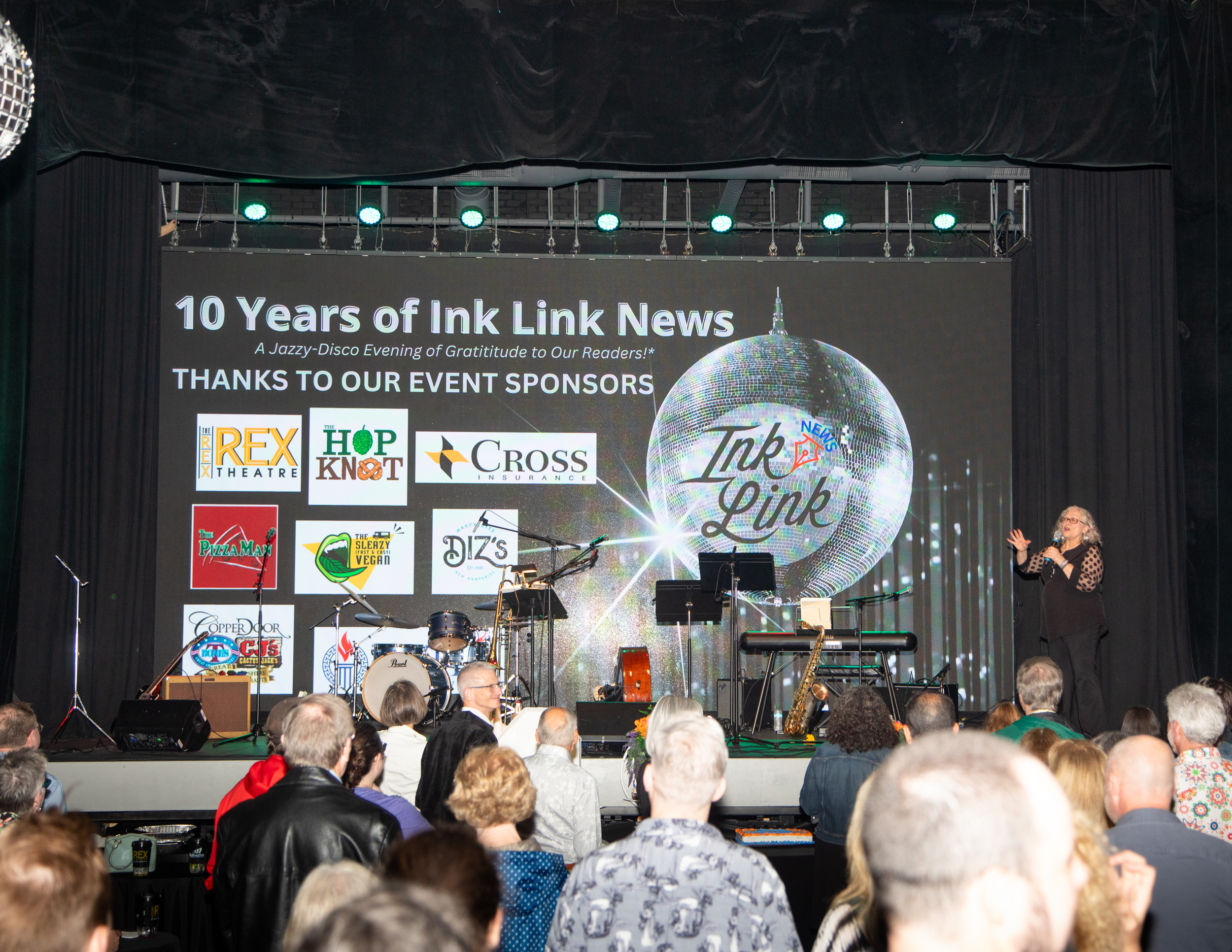 The celebration took place at the Rex Theater on Amherst Street, part of the Palace Theatres, which Carol identified as the organization’s first-ever advertiser. Sponsors of the anniversary event included The Pizza Man, Diz’s Cafe, The Sleazy Vegan, Fotia Greek Taverna, Great NH Restaurants, The HopKnot, The Moka Pot at City Hall Pub and Cross Insurance. A high school-age instrumental jazz band called The Real Deal performed for the crowd, jamming out tunes both energetic and soulful.