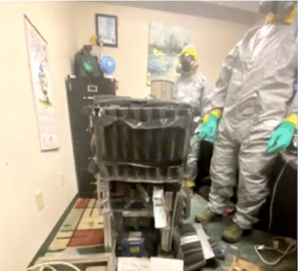 While searching the defendantโs office suite, the DEAโs Clandestine Laboratory Team found an industrial-grade mechanical pill press covered in a powdered residue and wrapped in foam soundproofing material, which was used to conceal its sound and avoid detection. Also inside the defendantโs office suite were dozens of kilograms of various powders used for making pills; a vacuum sealing device; dozens of punch and die sets; packaging material; and approximately 20,000 pressed pills, many of which were consistent with the orange and blue pills that the defendant sold during the controlled buys. DEA tested some of the pills and powders recovered from the defendantโs office suite, which were found to contain more than 12 pounds of a mixture and substance containing methamphetamine (5,651.35 grams) and almost three pounds of a mixture and substance containing fentanyl (1,259.64 grams).