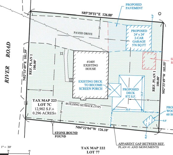 Thomas Huot (Agent) proposes to construct a rear deck and detached garage resulting in lot coverage of 49.3% where 40% is allowed, where the detached garage is located partially in the side yard with a side yard setback of 1.4โ where 20โ is required and has a height of 23.5โ where 15โ is allowed, where the deck has a rear yard setback of 14.8โ where 30โ is required and a side yard setback of 15.2โ where 20โ is required, and where the proposed deck results in an existing shed being 1โ into the side yard where it does not meet side yard setbacks and seeks a variance from sections 6.04 Lot Coverage, 8.29(A) Accessory Structures in the Side Yard (3 counts), 6.03(B) Rear Yard Setback and 6.03(C) Side Yard Setback.