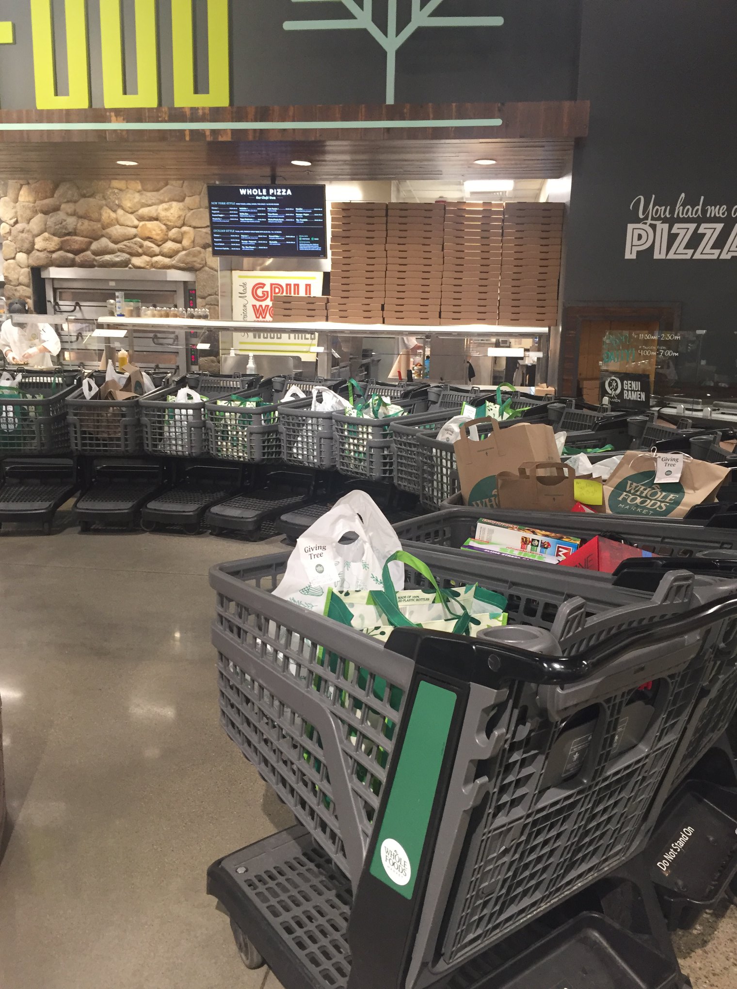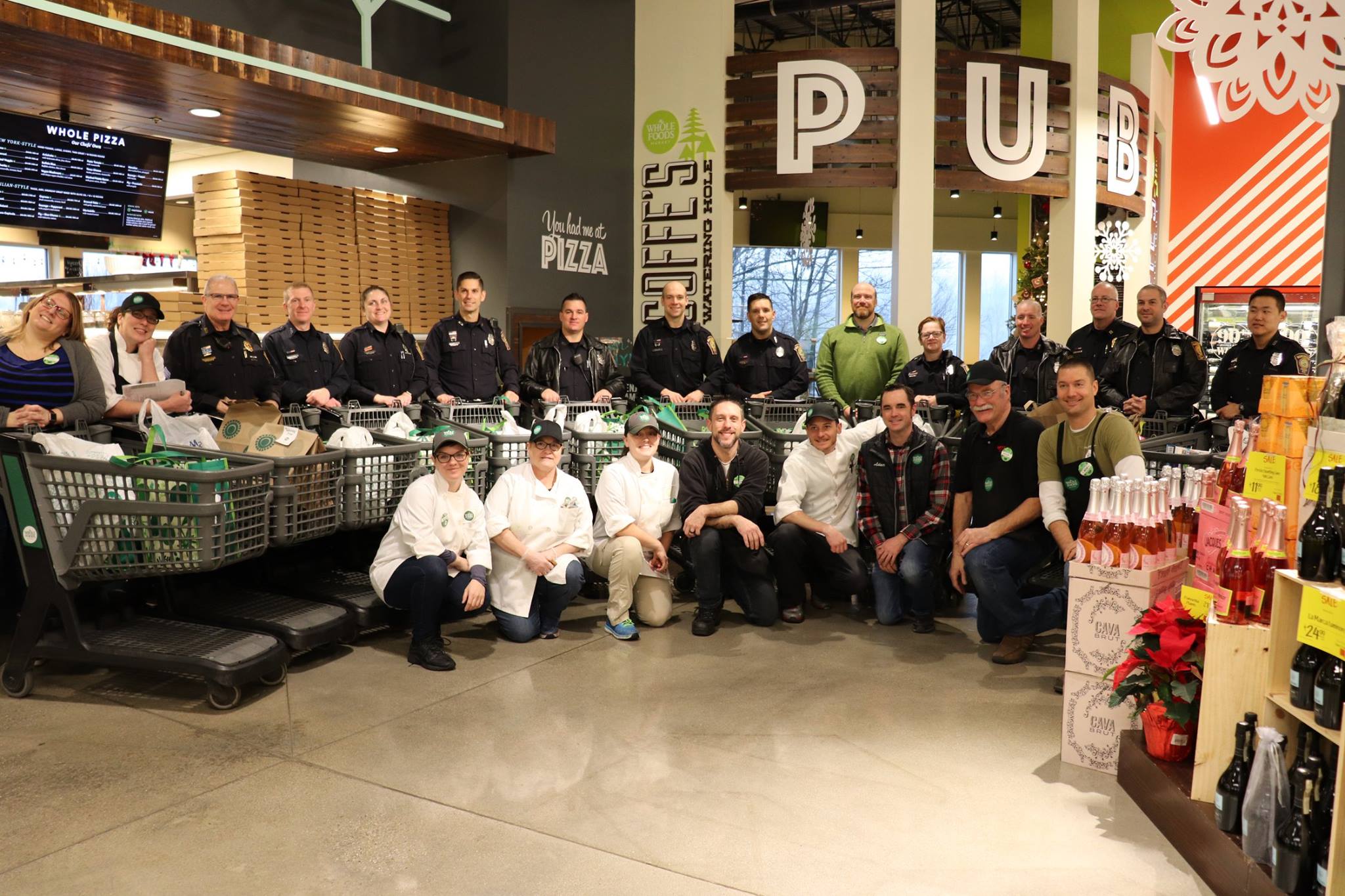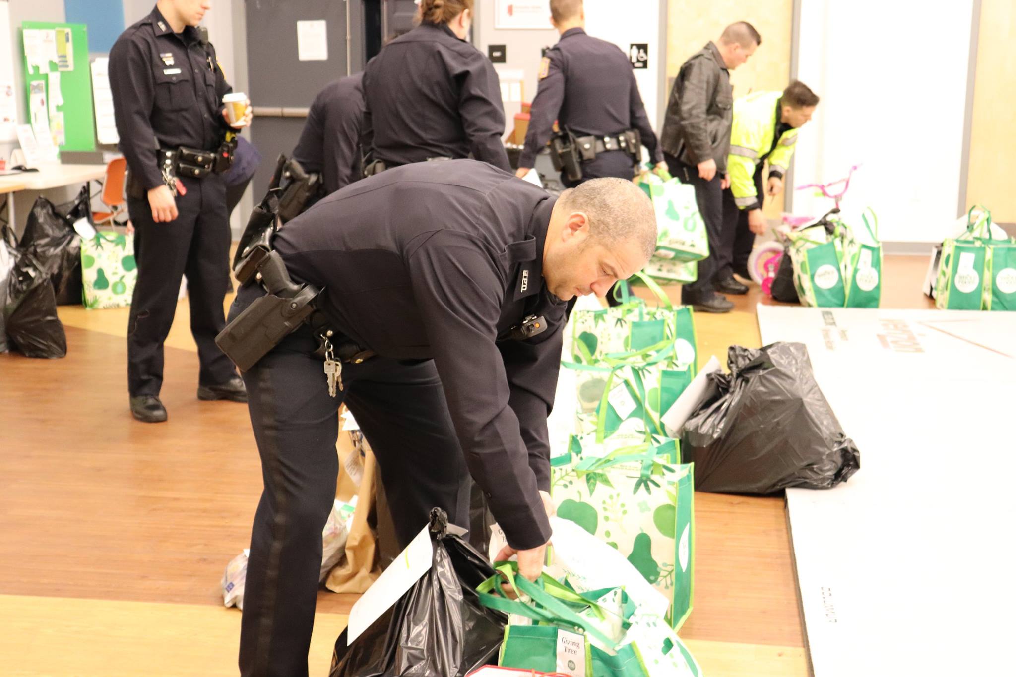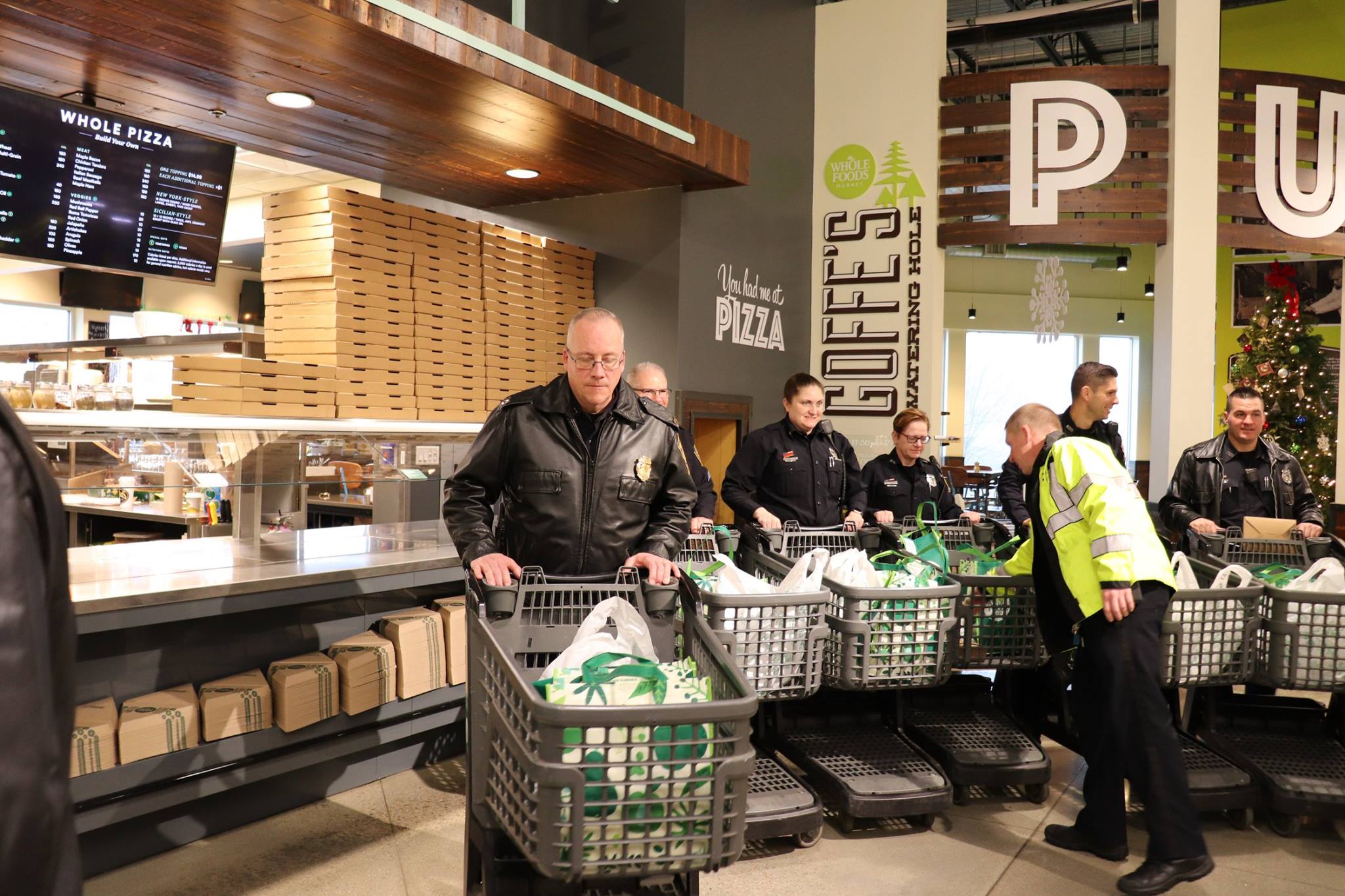 Officers manned shopping carts, which were filled with food and gift items, which were then packed up into grocery bags and delivered to 10 families in need.