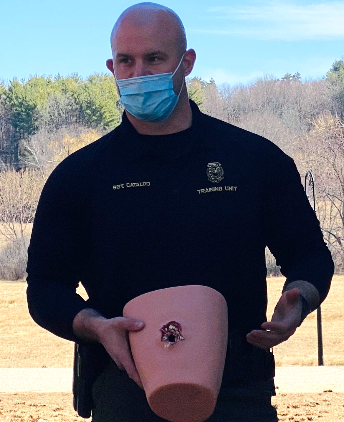 Sgt. Derek Cataldo, director of the departmentโs Training Unit, on Tuesday gave an overview of the training and demonstrated the equipment officers use during an event staged for the media at the John H. Sununu Youth Services Center.
