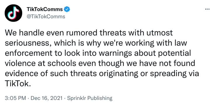 In a response posted Thursday via Twitter, TikTokย said it had not identified any videos making specific threats. โ€œWe have not found evidence of such threats originating or spreading via TikTok,โ€ the company wrote. TikTok said it is working with law enforcement to look into the warnings with โ€œutmost seriousness,โ€ nonetheless.