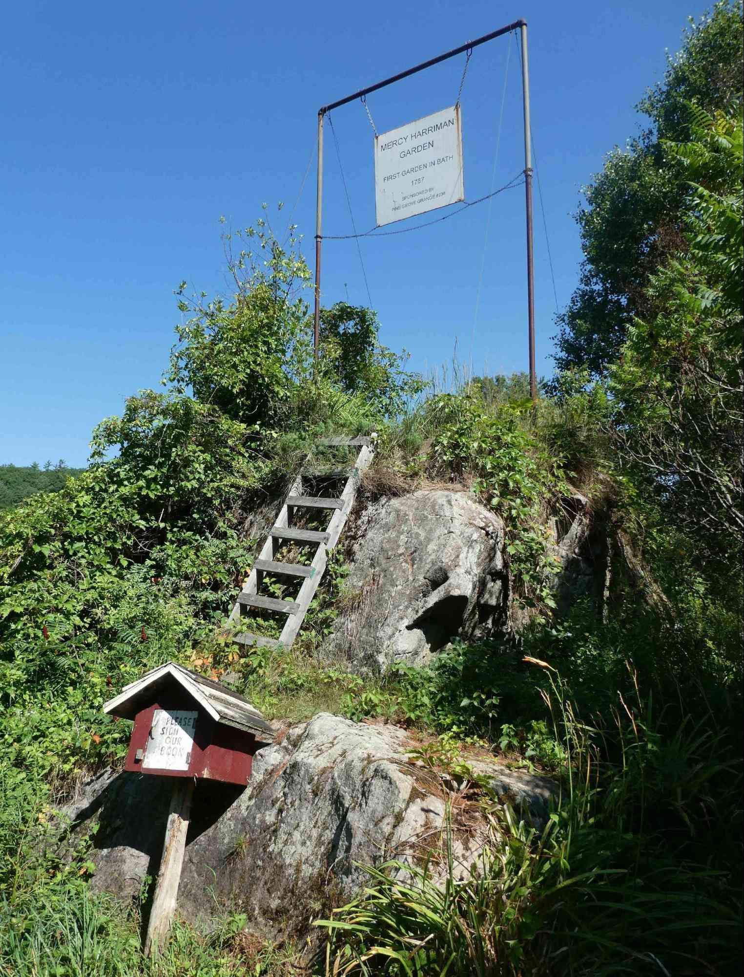 I think my favorite marker is the one in Bath: “Settled in 1766 by Jaasiel Harriman whose cabin was near the Great Rock. His nine-year-old daughter Mercy carried dirt in her apron to the top of this unique rock formation. Here she planted corn, pumpkins, and cucumbers, making the first garden in town.” I love the fact that this garden is still maintained by the Bath Historical Society. There is a small sign leading visitors to Mercy’s path. It is a short walk to the rock where you can climb a ladder to the top.
