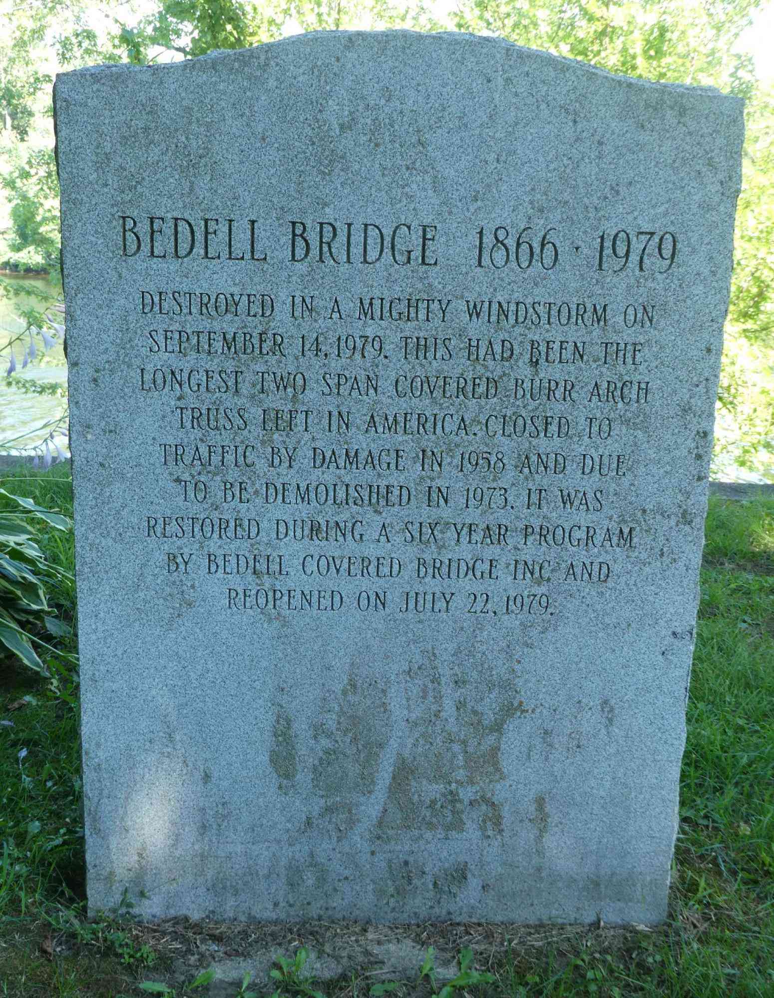 The Bedell Bridge, which was located in Haverhill, is marked by a tombstone.“Following several years of human effort which corrected decades of deterioration, the newly-restored landmark was destroyed by a violent windstorm on September 14, 1979.”