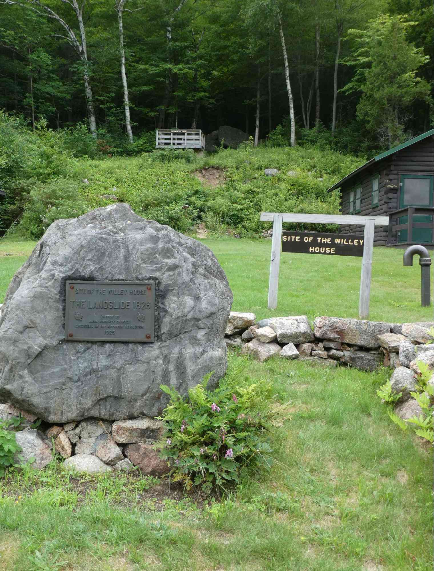 A bit farther down the road we stopped at the location of the Willey House. It does not have an historical marker but has an interesting history. The house was built in 1793 as a residence and an inn. Samuel Willey bought the house in 1825 and soon discovered that it was located at the base of a steep cliff and therefore susceptible to landslides. One landslide narrowly missed the house in June 1826. The family, fearing another landslide would destroy their home during a heavy rainstorm in August, left the house and ran into the path of the slide. All seven family members and two hired workmen were killed; the house was undamaged because a low ledge right behind it split the landslide into two channels which went on either side of the house. This disaster gained national attention; the publicity brought many tourists to Crawford Notch to see the house and debris.