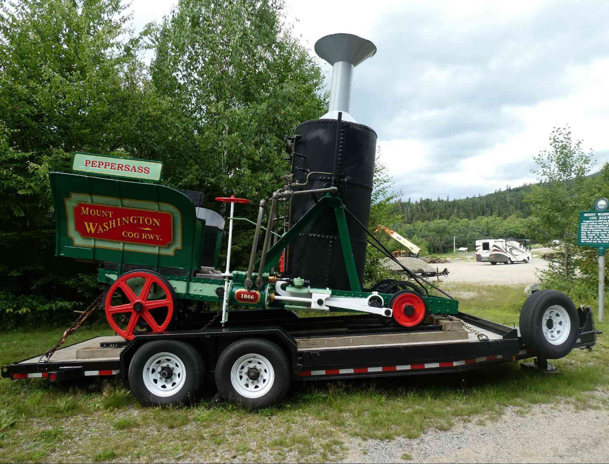The Mount Washington Cog Railway is the second steepest and the oldest cog railway still in operation in the world. The original locomotive, which was nicknamed ‘Old Peppersass’, was designed to build the railroad. It first reached the summit on July 3, 1869, and continued to provide passenger service until 1878. The original engines were wood-fired; they were replaced by two coal-fired steam locomotives which were manufactured in Manchester at the Manchester Locomotive Works in 1875 and 1908. As of 2008, the engines are diesel-powered. ‘Old Peppersass’ is on display at the base station for the Cog Railway in Bean’s Grant. (We had never heard of Bean’s Grant—the website for the Cog Railway says it is in Bretton Woods.)
