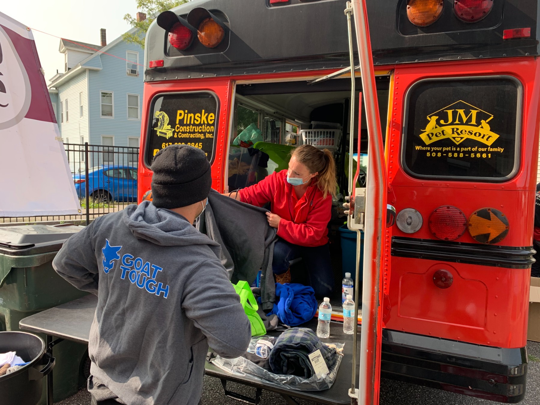 Volunteer Emily Flinn looks for some clothes to fit a recently showered man. New England charity group Support the Soupman offered free clothes and a backpack with toiletries to any homeless people who came to use the shower trailer behind St. Casimir Tuesday morning. Photo/Ryan Lessard
