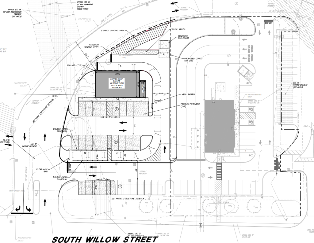 Applicant has submitted a planned development and site plan application for a 1,815 SF coffee shop with limited indoor seating, 22 new parking spaces, and a drive-thru lane, on a lease lot adjacent to the newly approved Service Credit Union.