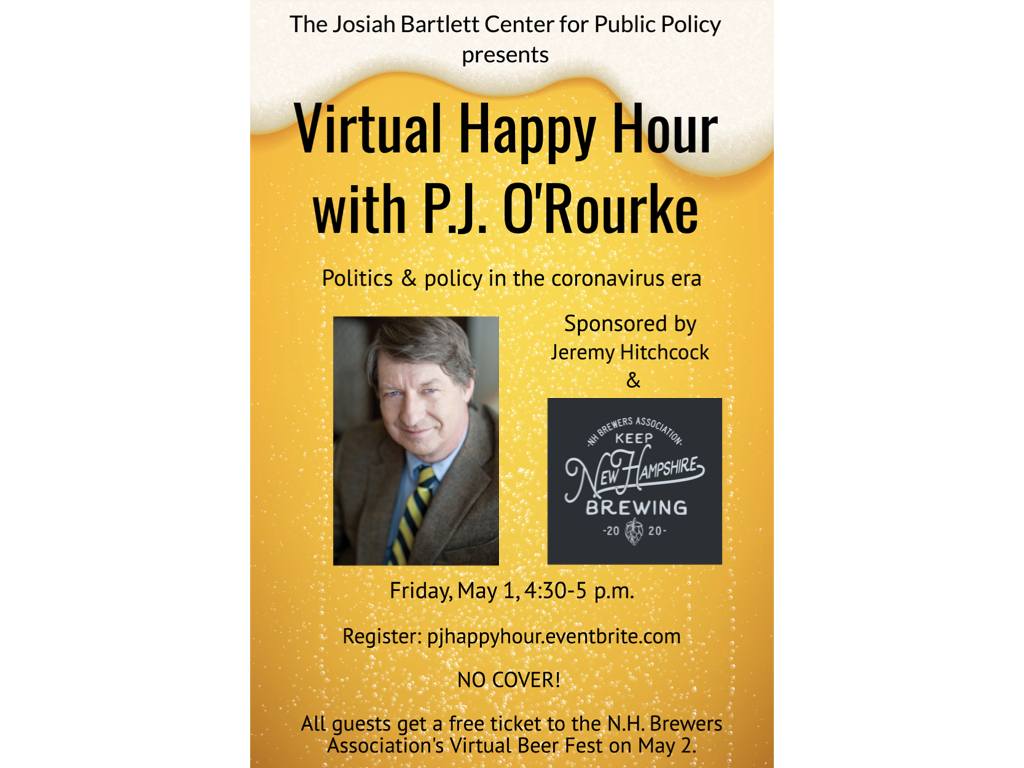 The Josiah Bartlett Center for Public Policy is hosting a Virtual Happy Hour with author P.J. O’Rourke this Friday, May 1, from 4:30-5 p.m. Join us to discuss politics & policy in the coronavirus era with America’s funniest political humorist.