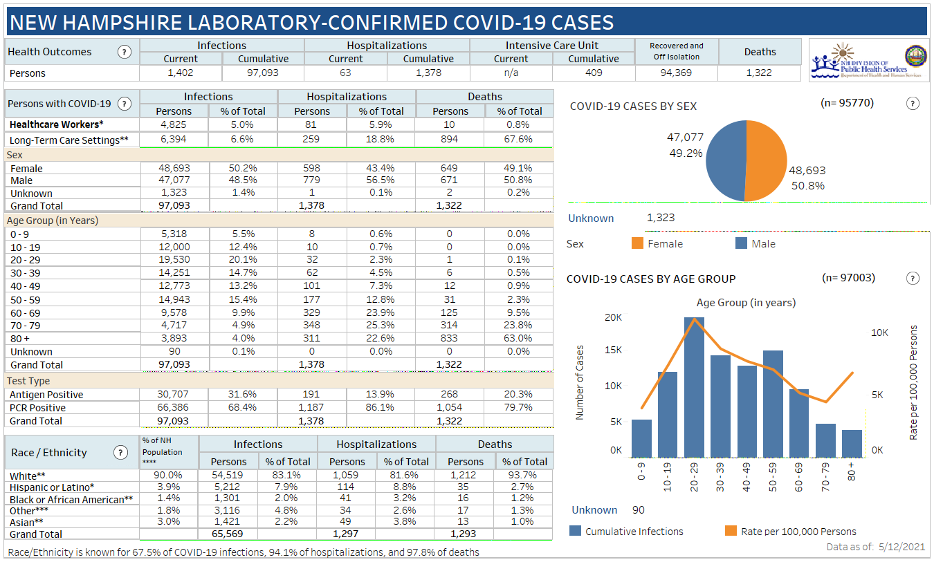 New Hampshire 2019 Novel Coronavirus (COVID-19) Summary Report (updated May 12, 2021, 9 a.m.)