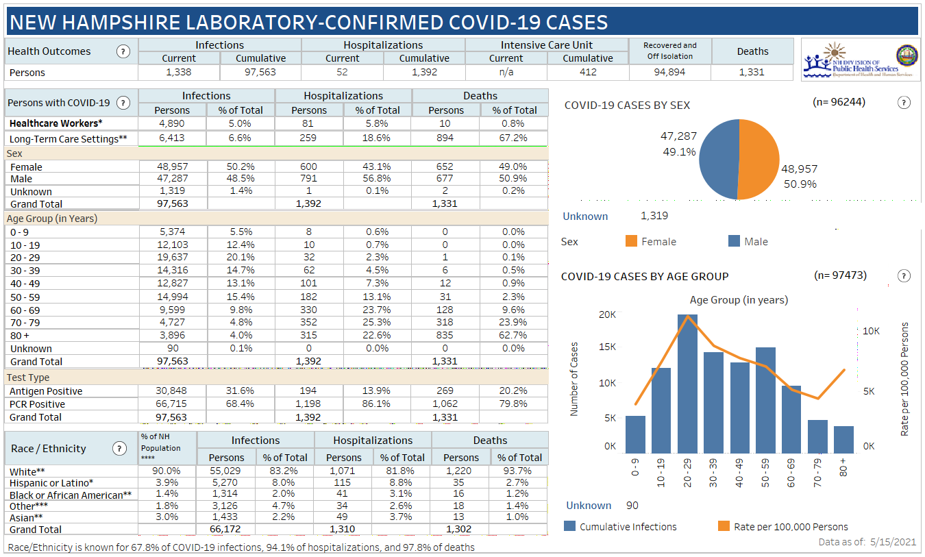 New Hampshire 2019 Novel Coronavirus (COVID-19) Summary Report (updated May 15, 2021, 9 a.m.)