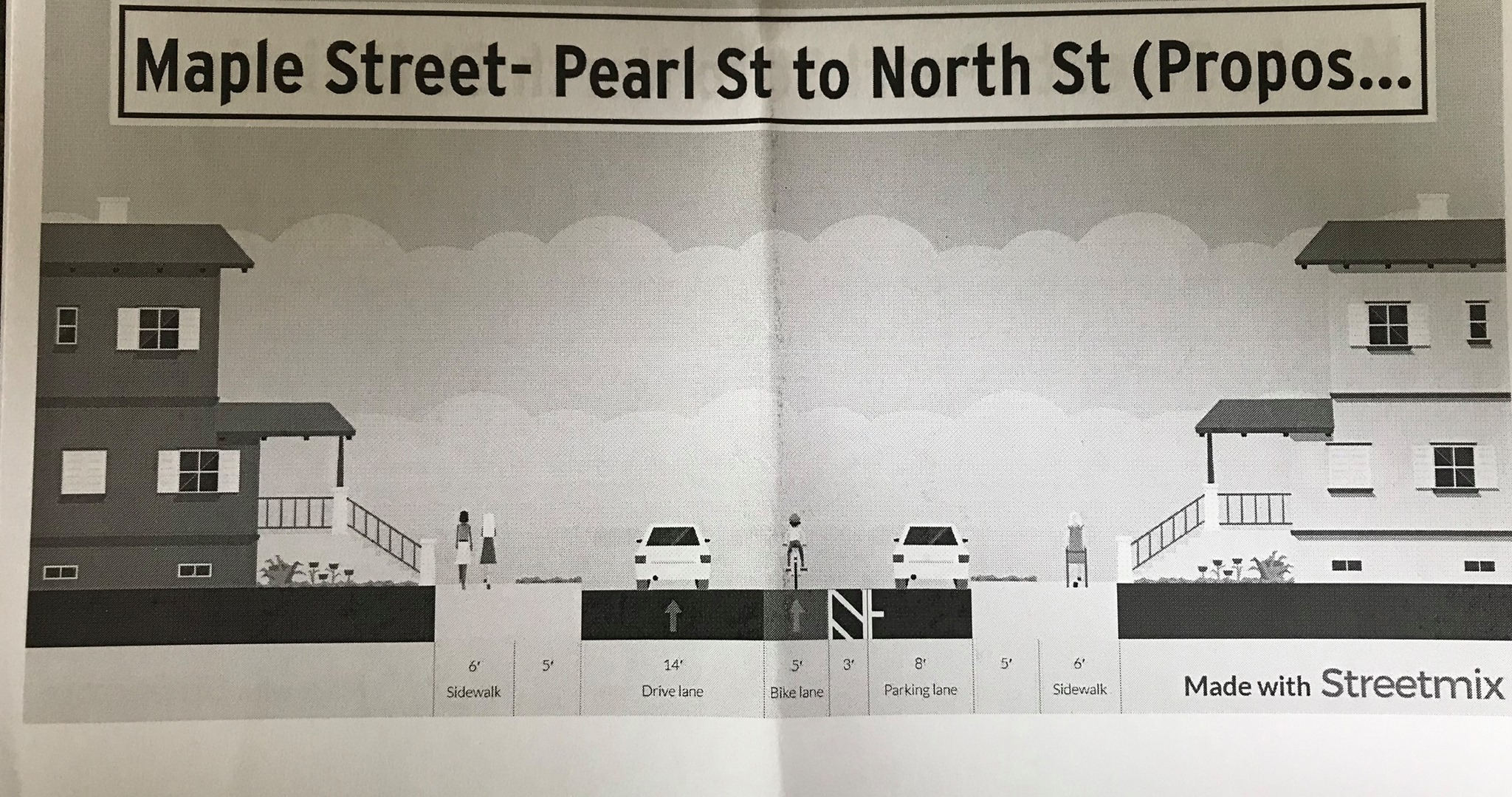 During the month of June, the Department of Public Works (DPW) is scheduled to pave Maple Street between Pearl and North streets. Prior to completing this work, DPW and the Planning & Community Development Department will reduce the two vehicular travel lanes down to one vehicular travel lane and one bicycle lane.