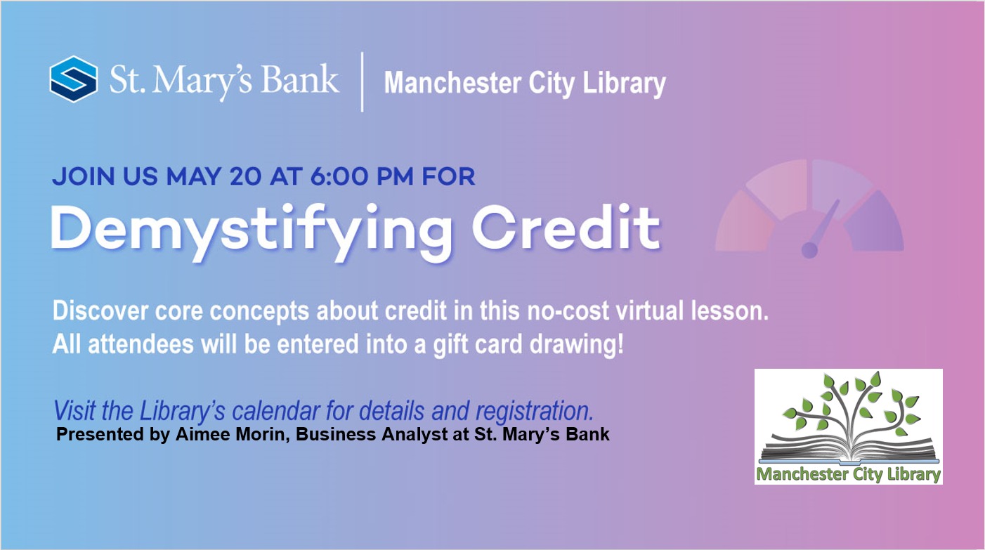 The Manchester City Library has partnered with St. Mary’s Bank to bring you a virtual lesson on Credit! Watch this talk on Thursday, May 20, 2021, at 6 p.m. via Zoom.