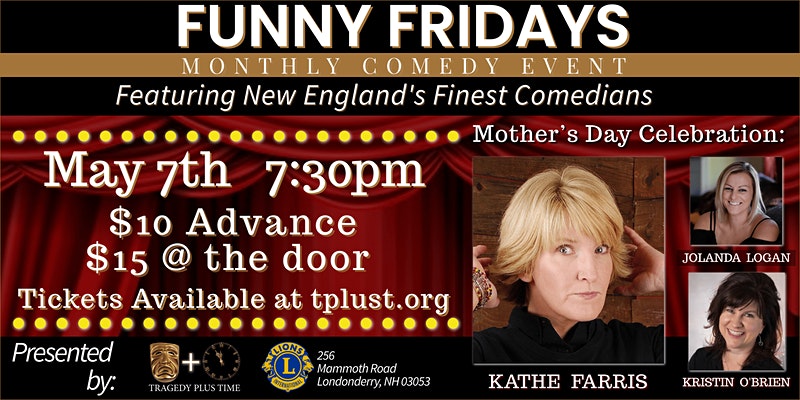 You’ve been cooped up for over a year now – it’s time to get out and laugh! Come to the inaugural performance of Funny Fridays at the Londonderry Lions. We’ll be hosting three of New England’s finest comedians (and moms) on this most special of occasions, Mother’s Day Weekend. Our performers: