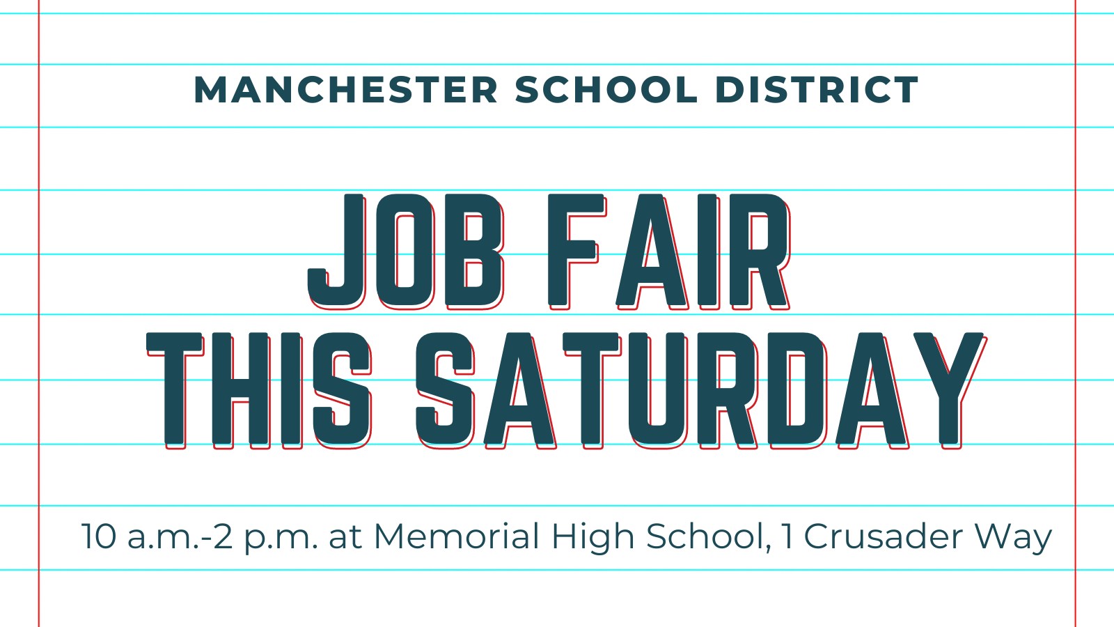 MANCHESTER, NH โ€“ The Manchester School District is hosting a job fair May 7 at Memorial High School, 1 Crusader Way, from 10 a.m. to 2 p.m. Several community partner organizations will be on hand also with job openings for many positions, including full-time, part-time and summer jobs. Partner organizations include: