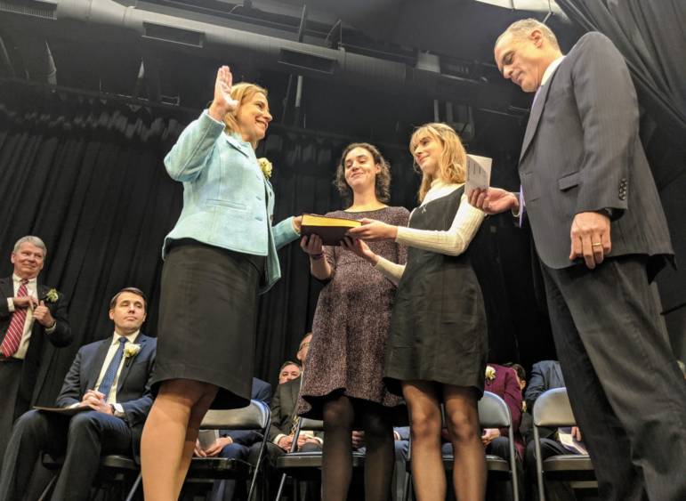Mayor Joyce Craig was sworn in for a second term on Jan. 7, 2020, as Millyard Museum Director John Clayton, far left, and U.S. Congressman Chris Pappas, seated, look on. Photo/Carol Robidoux