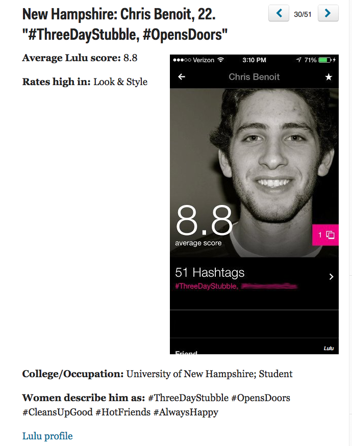 Screen Shot 2014-12-01 at 10.53.32 AMAccording to his Lulu app profile, Benoit scored an average score of 8.8 among girls who know him. His positive feedback includes things like #OpensDoors, #AlwaysPays, #SweetToMom, #LifeOfTheParty and #StrongHands.