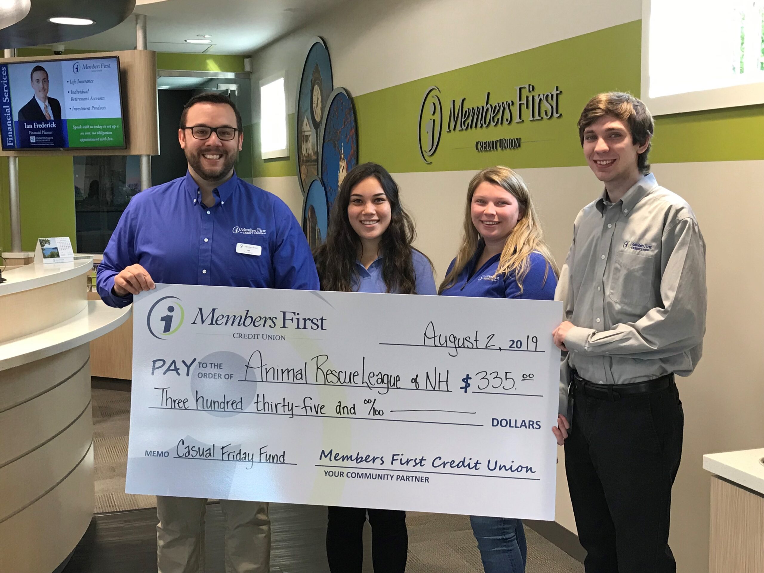 MANCHESTER, NH โ Members First Credit Union employees take casual day seriously. Each Friday, they give $5 to dress down in jeans and other casual attire to support local charities. Members First recently donated $335 from the Casual Friday Fund to Animal Rescue League of New Hampshire, a nonprofit organization in Bedford that provides care for homeless and neglected animals.